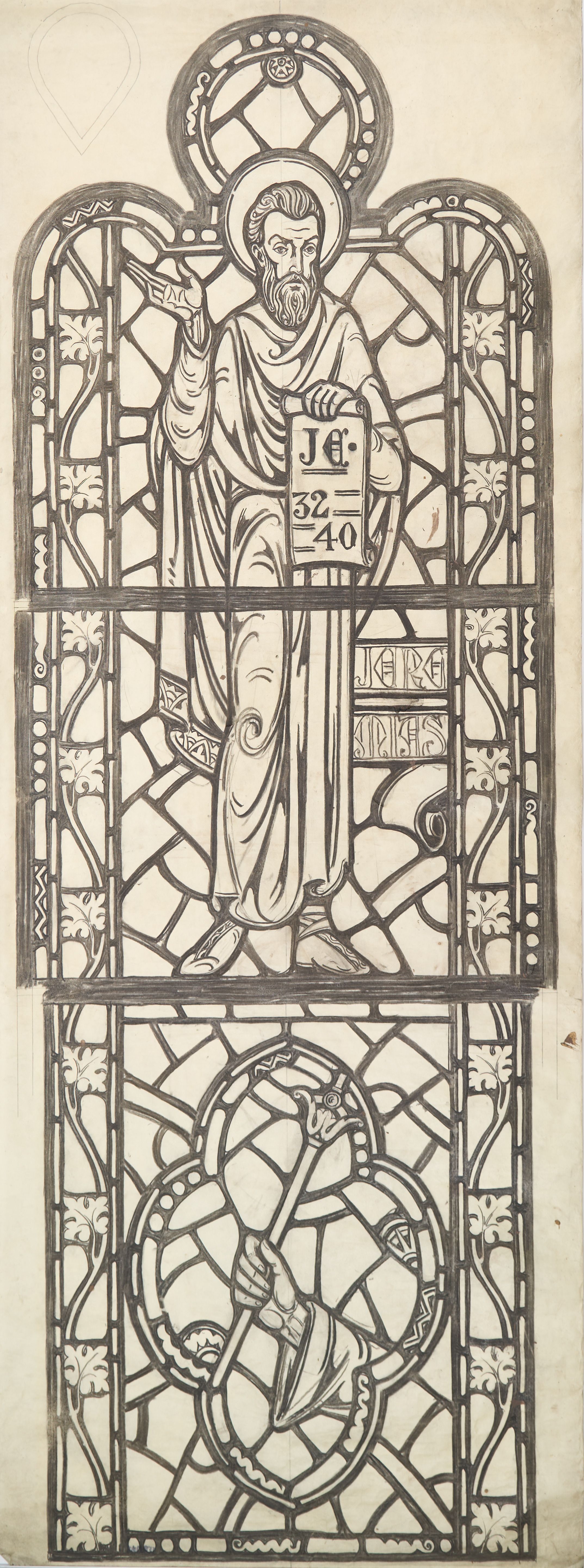 Stained glass scale cartoon for window in St. Gregory the Great Catholic Church, Chicago, IL. This is the left light of the fifth window from the sanctuary on the epistle side of the upper nave. Depictions from top to bottom: Jeremias or Jeremiah holding a scroll on which is written "JE 32 40" ("With them I will make an everlasting covenant, never to cease doing good to them; I will put fear of me in their hearts so that they never turn away from me."); a hand holding a scepter. In-situ image from: https://www.motherofgodchicago.org/upper-nave.htmlType of Drawing
