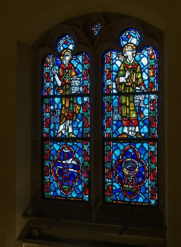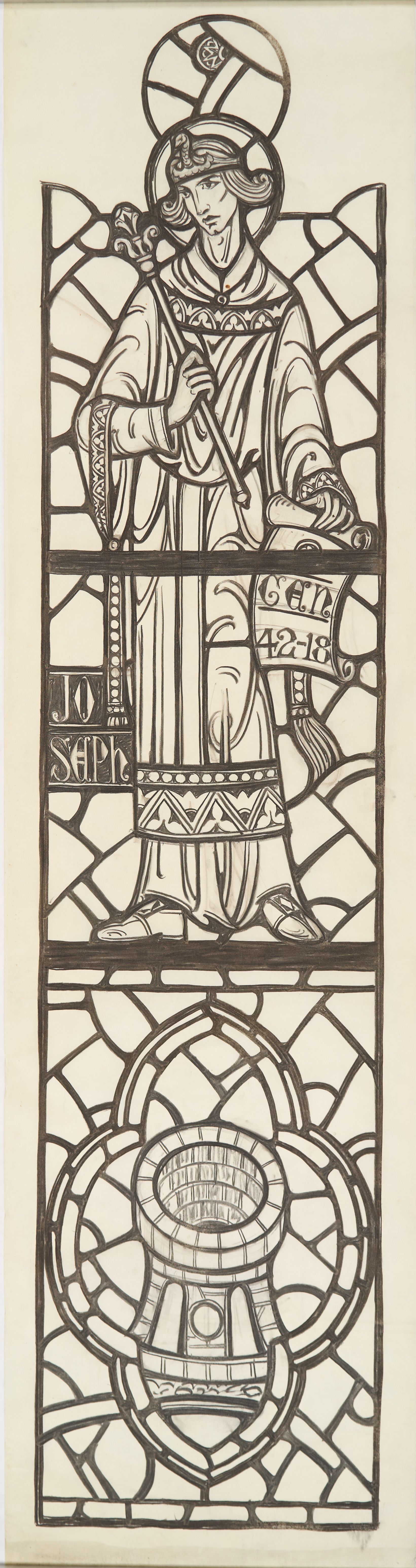Stained glass scale cartoon for window in St. Gregory the Great Catholic Church, Chicago, IL. This is the right light of the second window from the sanctuary on the epistle side of the upper nave. Depictions from top to bottom: Joseph holding a rod and a scroll on which is written "GEN 42-18" ("On the third day Joseph said to them: 'Do this, and you shall live; for I am a God-fearing man.'"); a well.