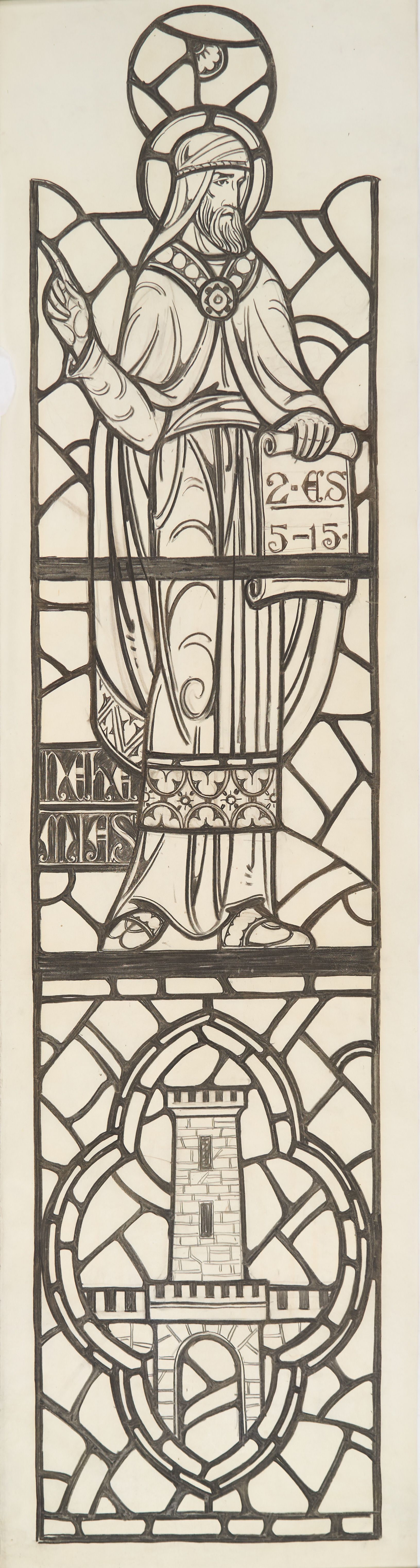 Stained glass scale cartoon for window in St. Gregory the Great Catholic Church, Chicago, IL. This is the left light of the third window from the sanctuary on the epistle side of the upper nave. Depictions from top to bottom: Nehemias or Nehemiah holding a scroll on which is written "2-ES 5-15" ("The earlier governors, my predecessors, had laid a heavy burden on the people, taking from them each day forty silver shekels for their food; then, too, their attendants oppressed the people. But I, because I feared God, did not do this"); a castle.