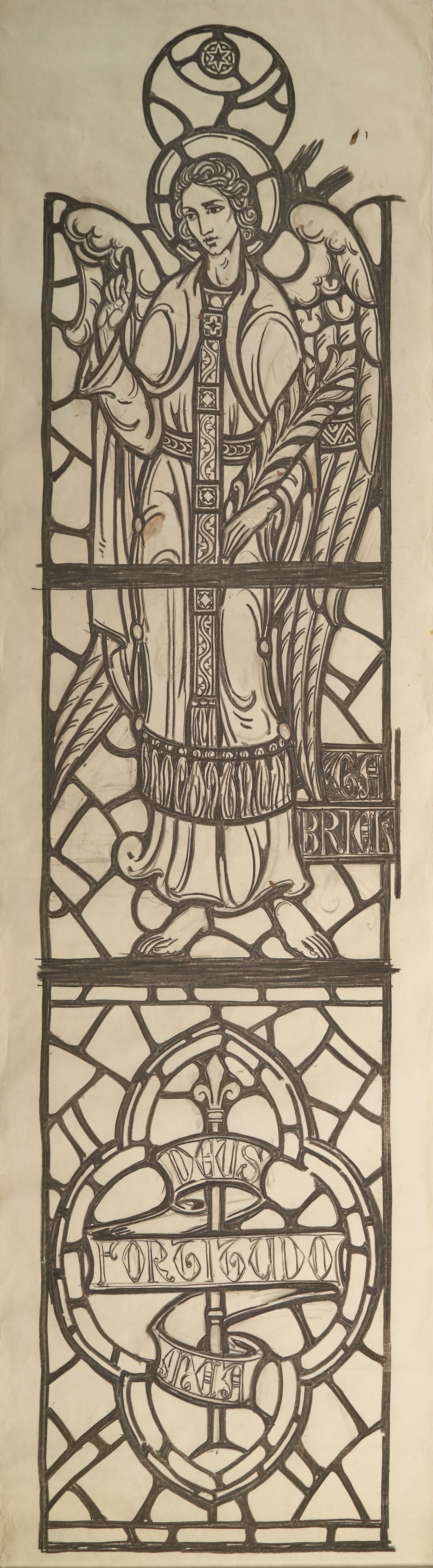 Stained glass scale cartoon for window in St. Gregory the Great Catholic Church, Chicago, IL. This is the right light of sixth window from the sanctuary on the gospel side of the upper nave. Depictions from top to bottom: the Archangel Gabriel with a palm leaf; a ribbon with the words "DEUS FORTITUDO MEA" ("God is my Strength").