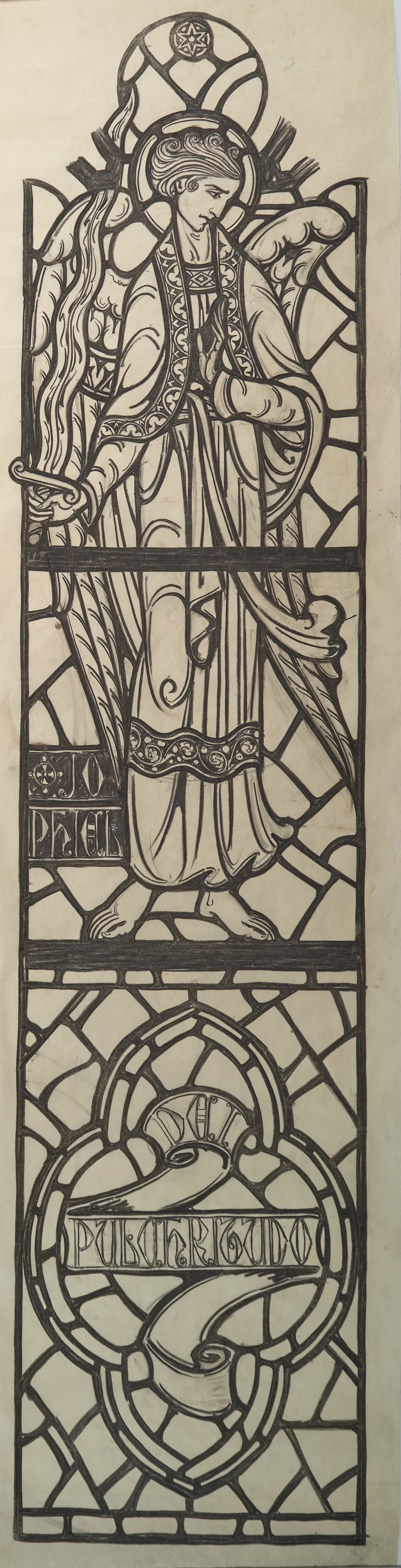 Stained glass scale cartoon for window in St. Gregory the Great Catholic Church, Chicago, IL. This is the right left of second window from the sanctuary on the gospel side of the upper nave. Depictions from top to bottom: the Archangel Jophiel with a sword; a ribbon with the words "DEI PULCHRITUDO" ("the beauty of God").