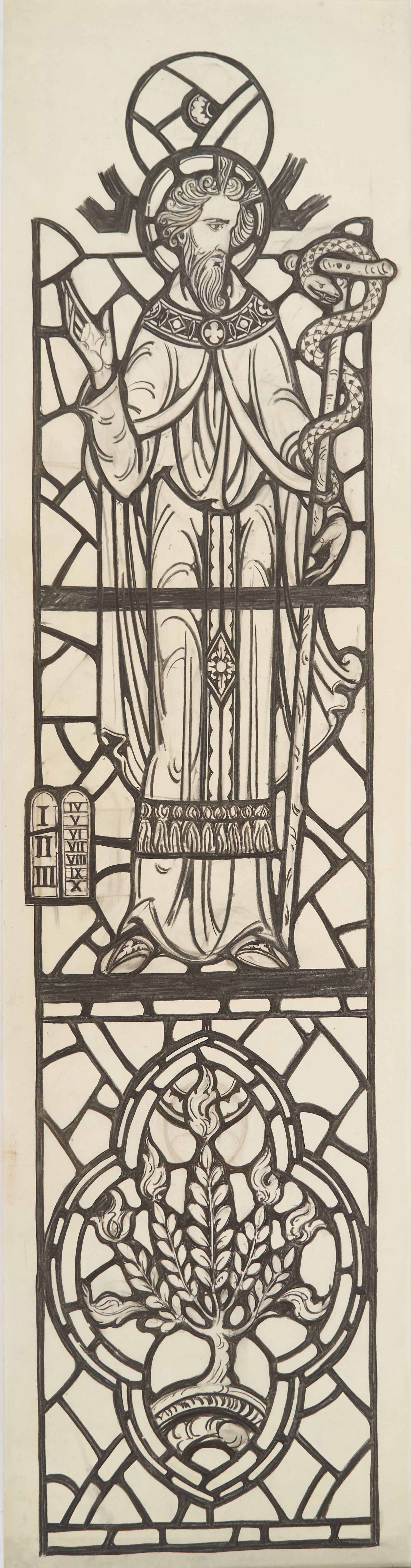 Stained glass scale cartoon for window in St. Gregory the Great Catholic Church, Chicago, IL. This is the left light of the sanctuary window on the gospel side of the upper nave. Depictions from top to bottom: Moses with horns holding a staff with a snake wrapped around it (Nehushtan); the Ten Commandments; the Burning Bush.