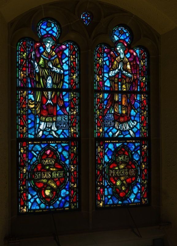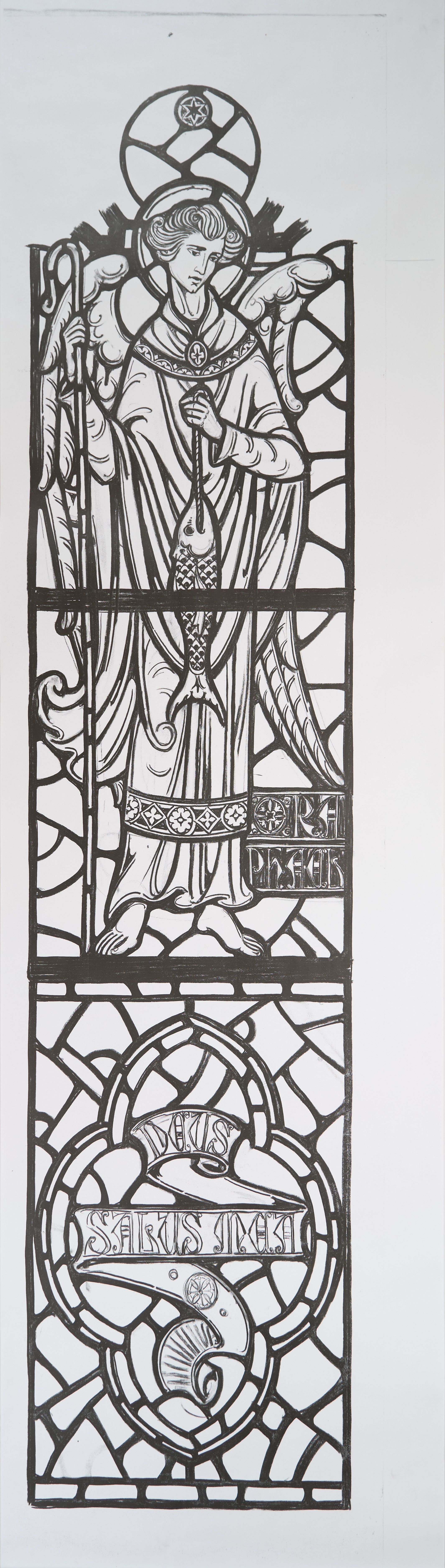 Stained glass scale cartoon for window in St. Gregory the Great Catholic Church, Chicago, IL. This is the left light of fourth window from the sanctuary on the gospel side of the upper nave. Depictions from top to bottom: the Archangel Raphael with a crozier and fish; a ribbon with the words "DEUS SALUS MEA" ("God is my Salvation"). Almost an exact copy of 2021.1.330.