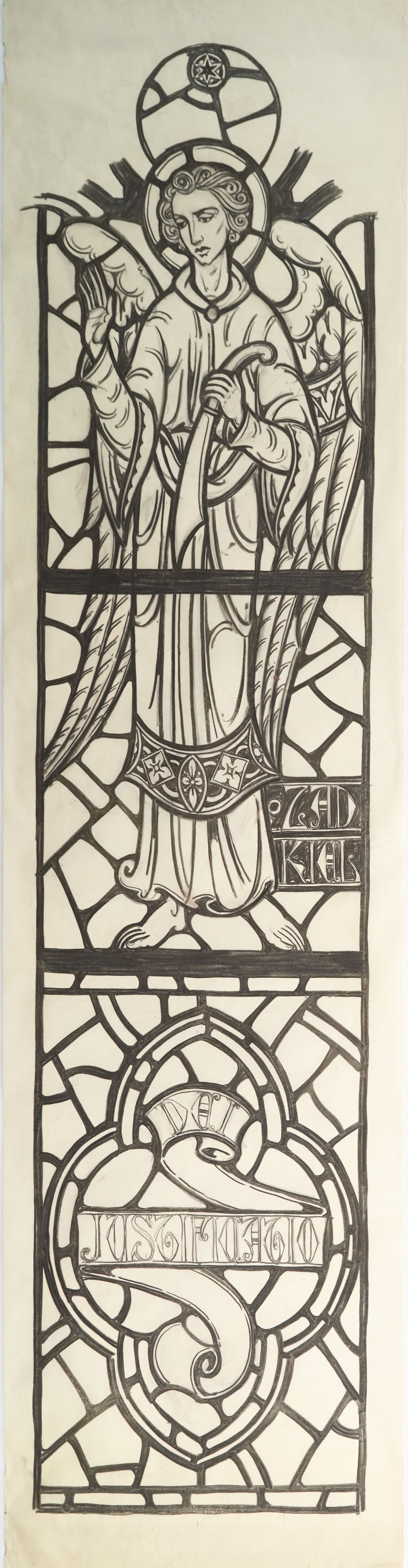 Stained glass scale cartoon for window in St. Gregory the Great Catholic Church, Chicago, IL. This is the right light of second window from the sanctuary on the gospel side of the upper nave. Depictions from top to bottom: the Archangel Zadkiel with a blade; a ribbon with the words "DEI JUSTIFICATIO" ("the judgement of God").