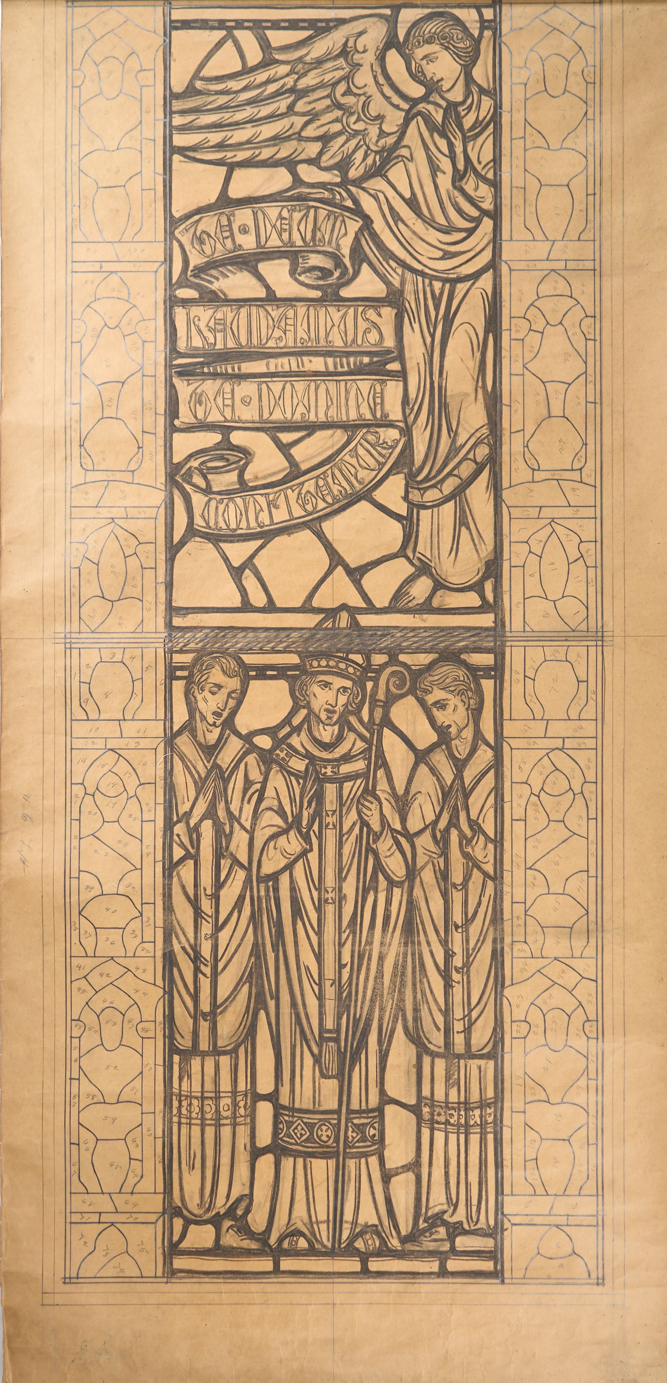 Stained glass scale cartoon, lower panel of left light of organ gallery window at St. Gregory the Great Catholic Church in Chicago, Illinois. Depicts an Angel with the phrase "Te deum laudamus, te domine confitemur" (We praise you, God, we confess you, Lord); a bishop and two priests.