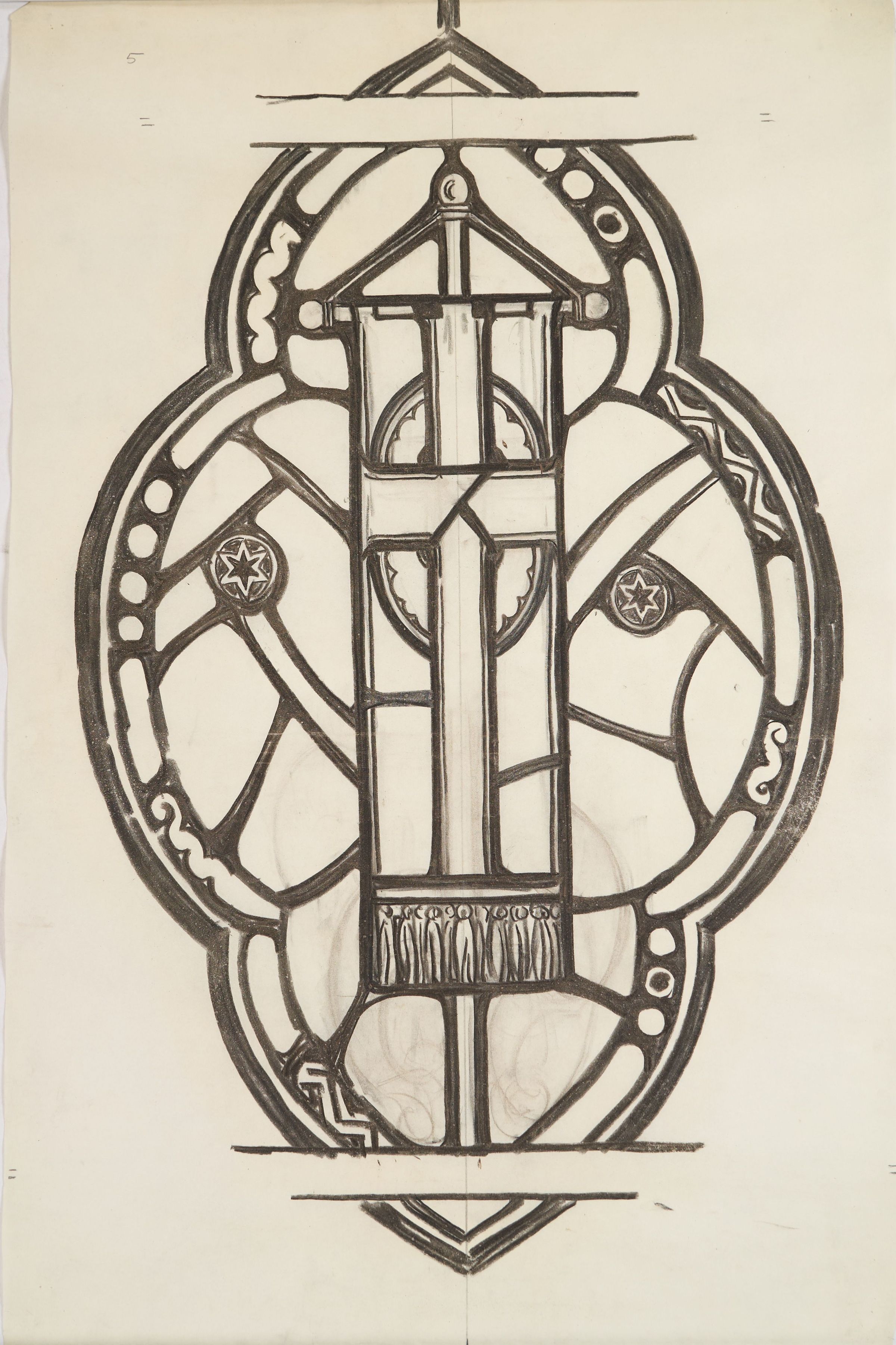 Stained glass scale cartoon; (rejected) emblem for St. Gregory the Great Catholic Church, Chicago, IL. Medallion depicting a banner.Type of Drawing