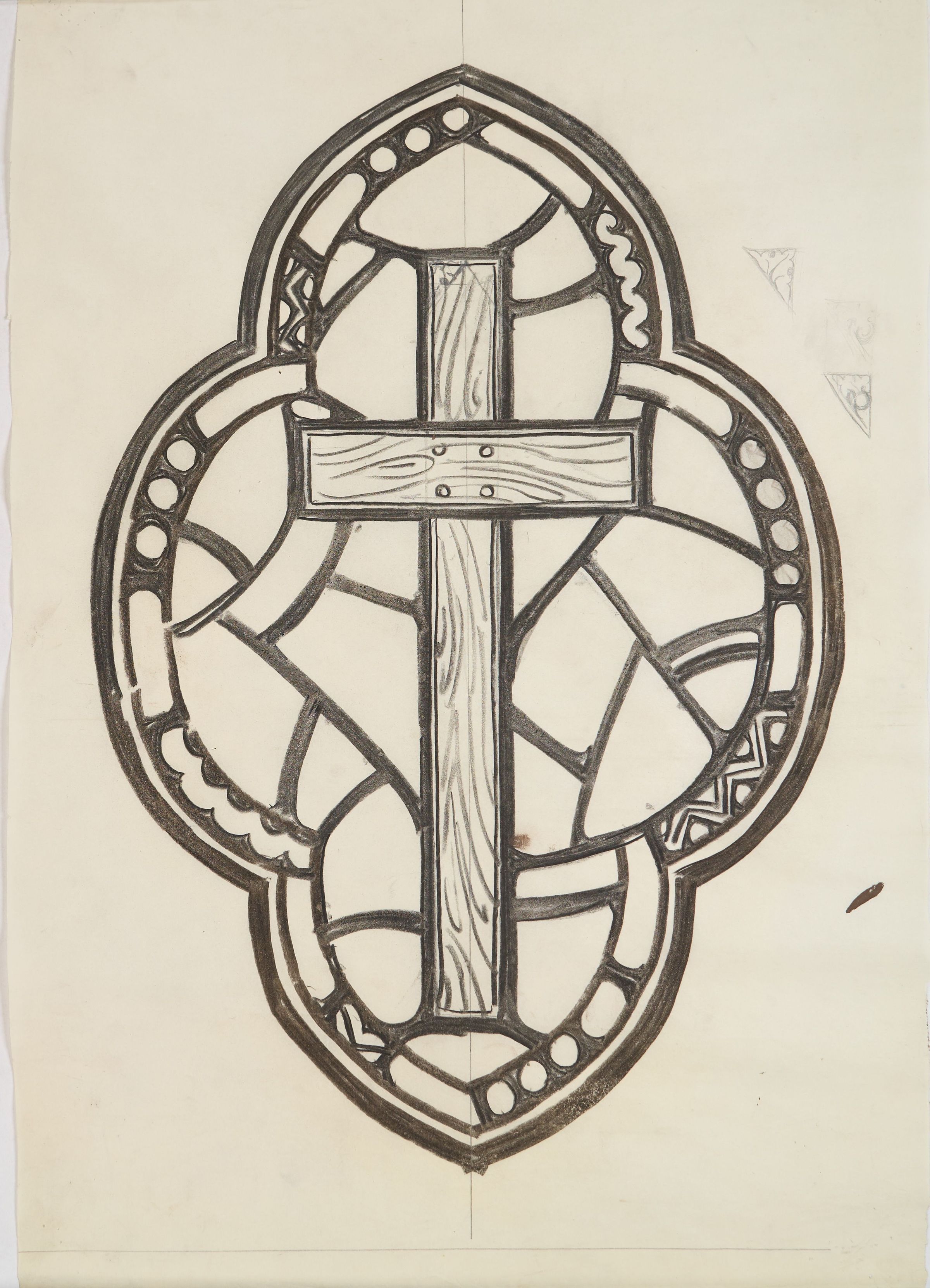 Stained glass scale cartoon; (rejected) emblem for St. Gregory the Great Catholic Church, Chicago, IL. Medallion depicting a cross.Type of Drawing