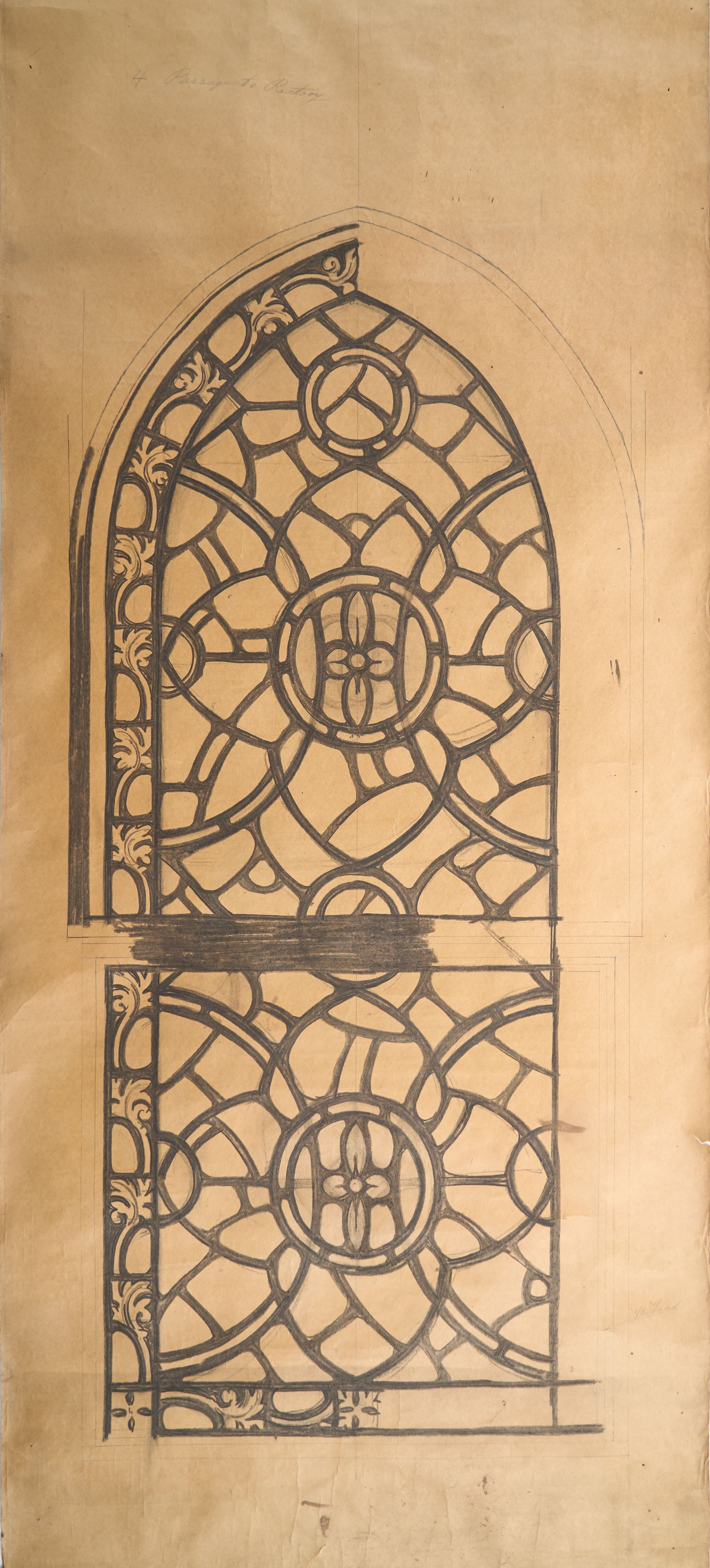 Stained glass scale cartoon, St. Gregory the Great Church, Chicago, IL. Grisaille window for a passage to rectory. Non-colored version of 2021.1.323.Type of Drawing