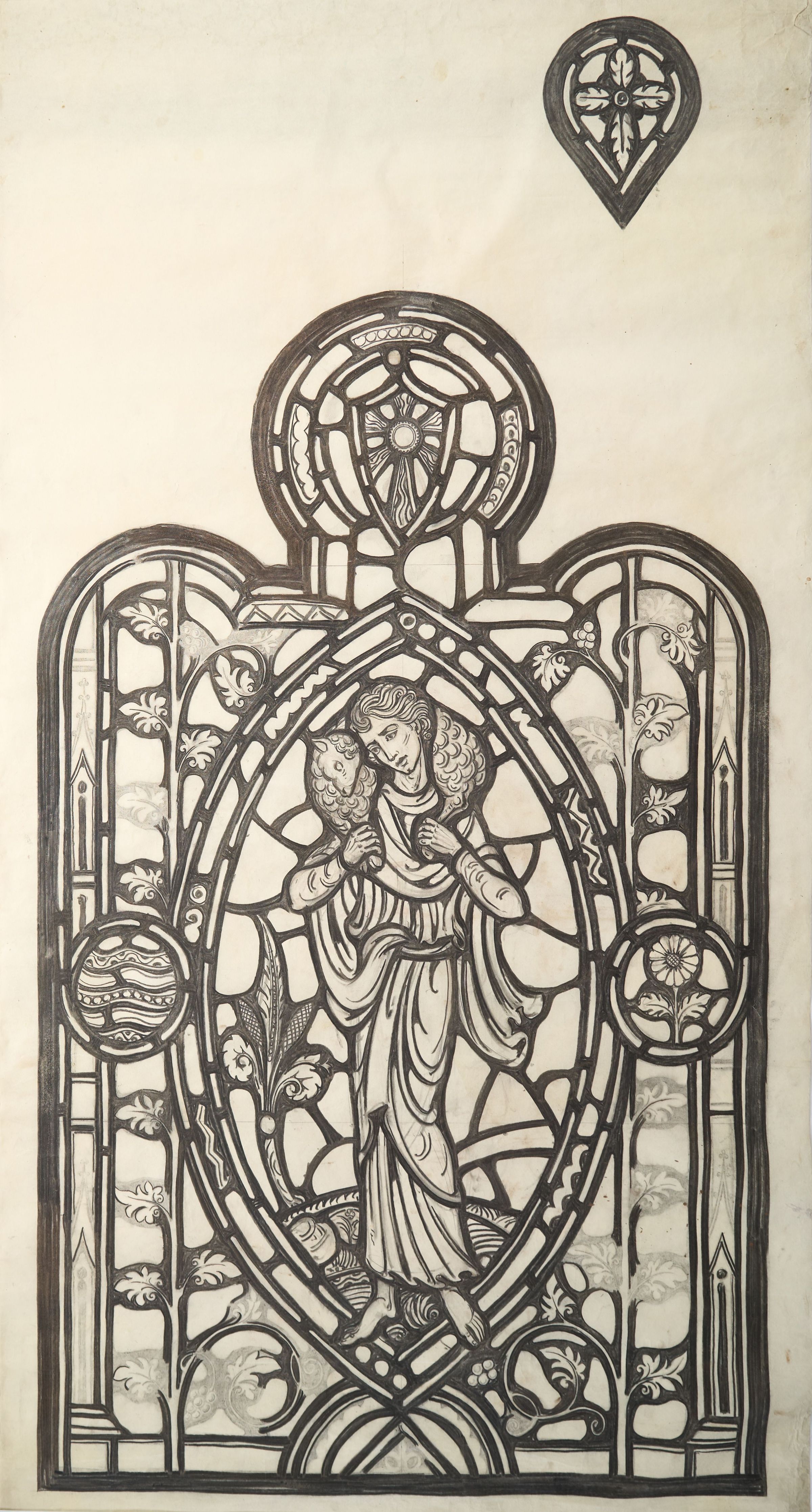 Stained glass scale cartoon for window in St. Gregory the Great Catholic Church, Chicago, IL. The is the right light of the window over the epistle (right) side confessional. Depicts the Good Shepard carrying a sheep on his shoulders.