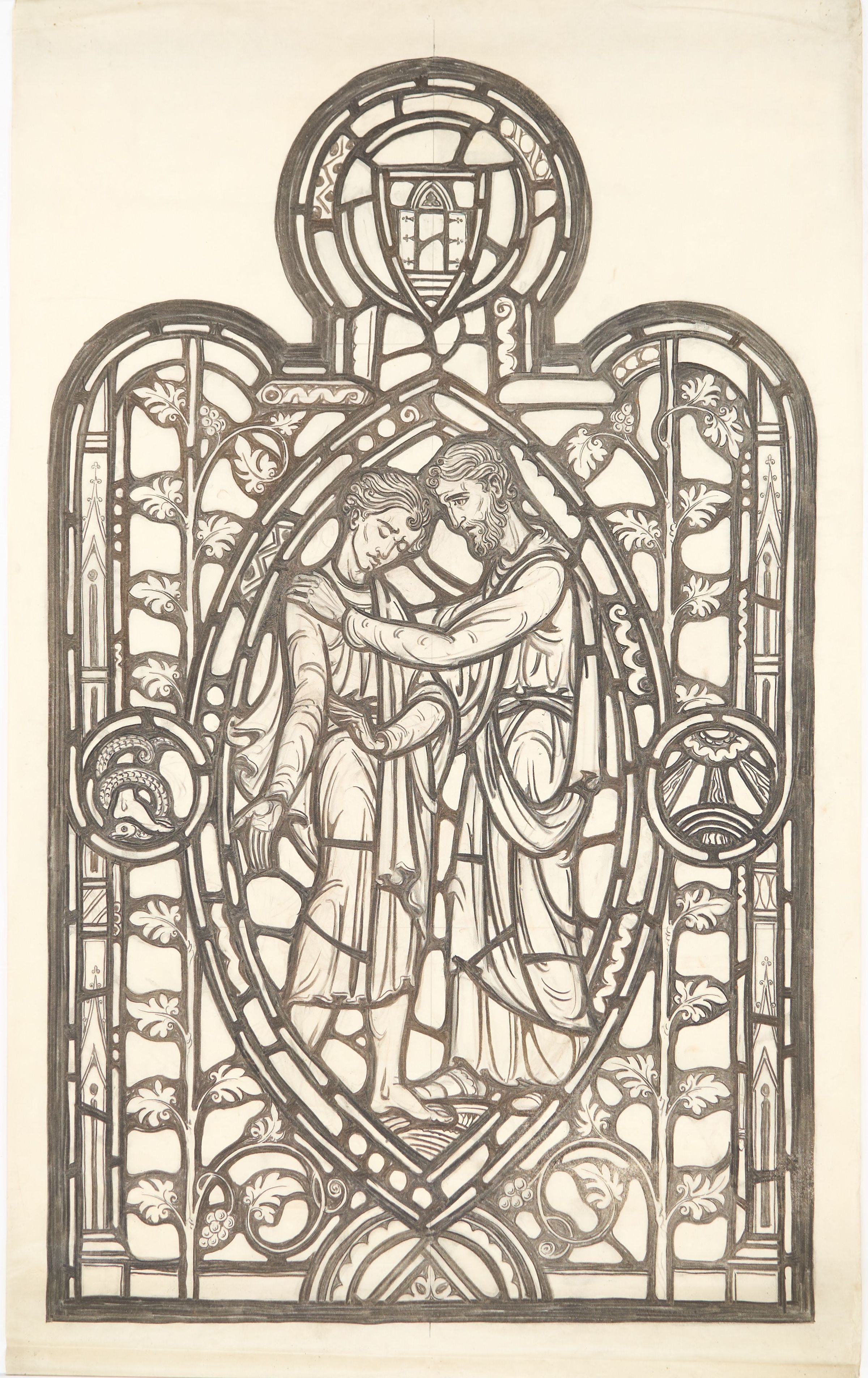 Stained glass scale cartoon for window in St. Gregory the Great Catholic Church, Chicago, IL. The is the right light of the window over the Gospel (left) side confessional. Depicts the prodigal son returning to his father.