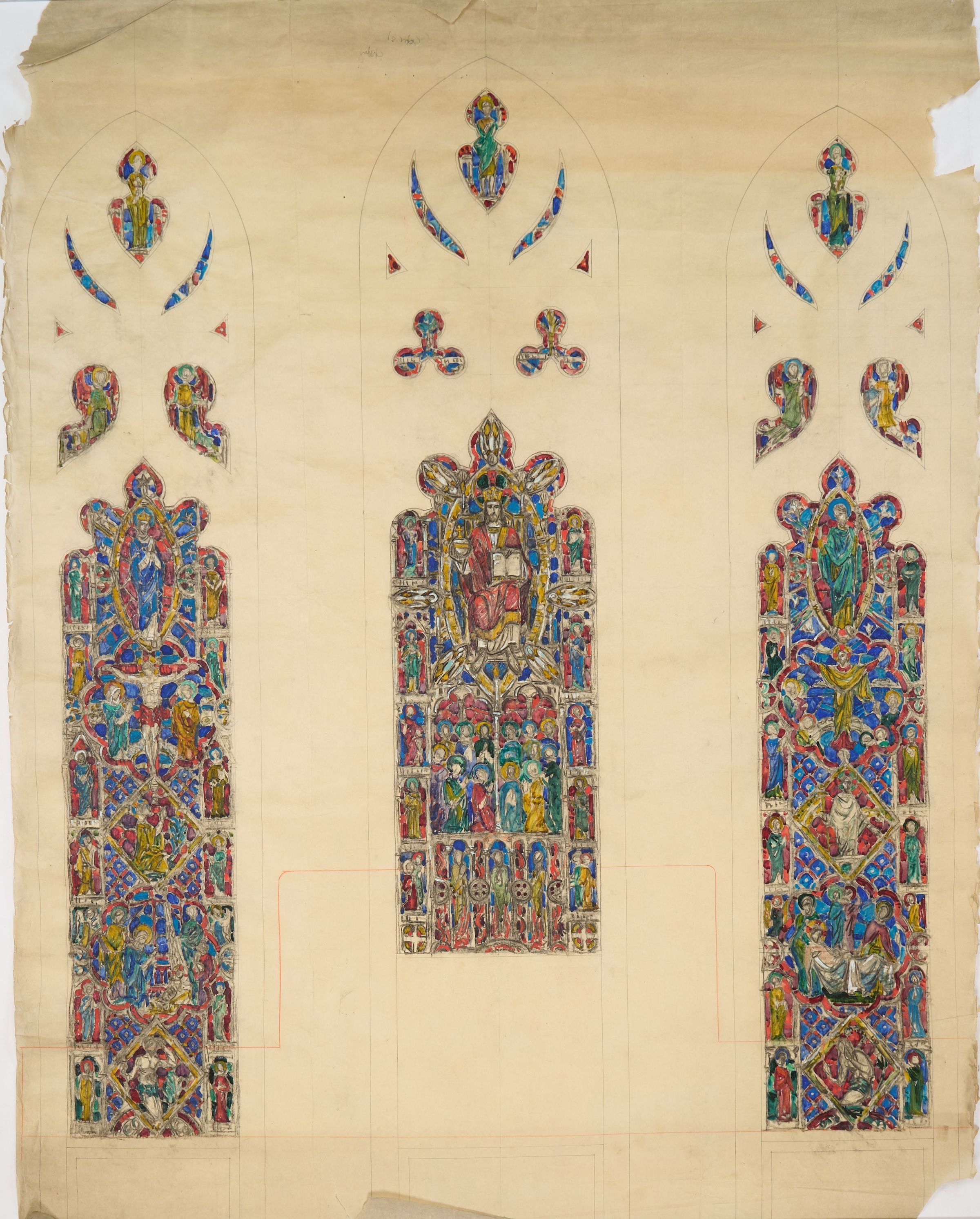 Stained glass scale sketch for the altar/chancel window in St. Gregory the Great Catholic Church, Chicago, IL. Matches in size and shape the chosen altar/chancel window sketch (see 2021.1.85). Around larger scenes are small figures of saints. Depictions, from top to bottom, left to right: the Virgin Mary, the Crucifixion, Christ at Gethsemani, the Nativity, the Baptism of Christ; Christ the King, the Twelve Apostles, [unknown]; St. Joseph, the Resurrection, Christ, the Burial of Christ, Christ in the Desert.Type of Drawing