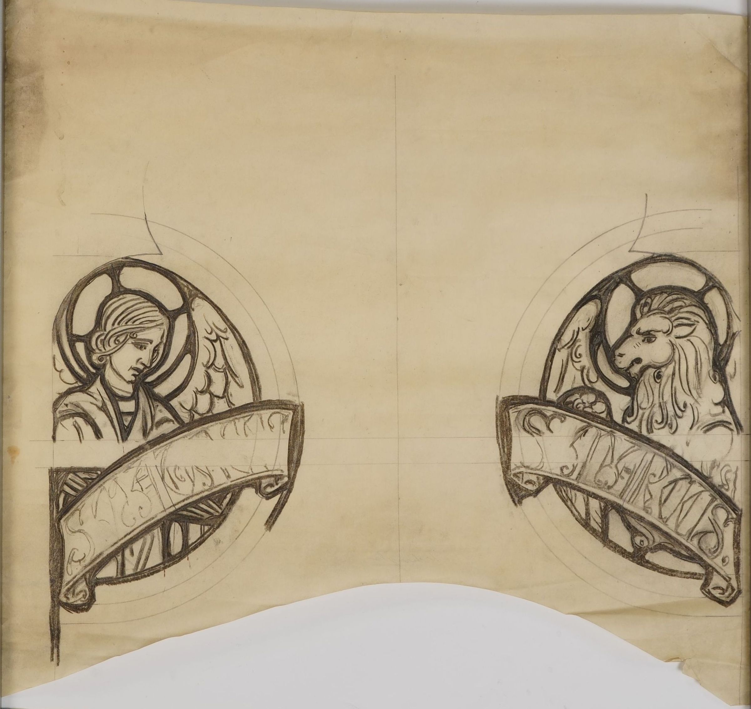 Stained glass scale cartoon, parts of altar window at St. Gregory the Great in Chicago, IL. Depicts St. Mathias (Matthew) and St. Marcus (Mark).Type of Drawing