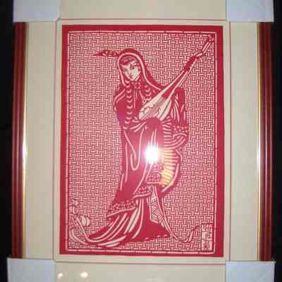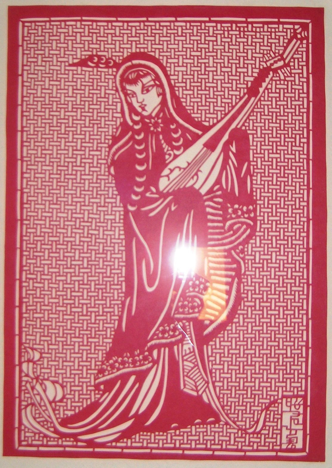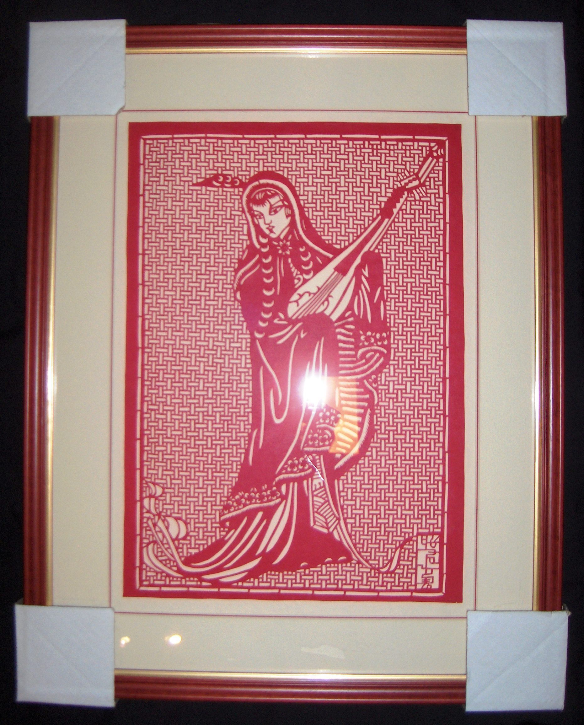 This is a paper cut from China, made out of red paper. The scene depicts a Chinese woman in traditional dress. The woman is playing a traditional Chinese instrument called a Pipa. There are Chinese characters on the bottom right corner but it is unknown to what they mean.Collection