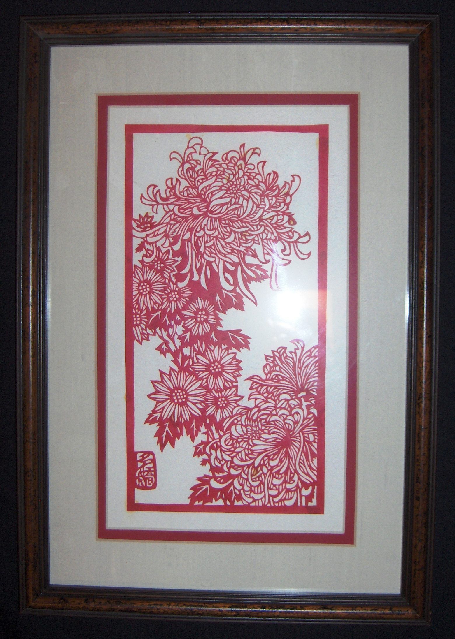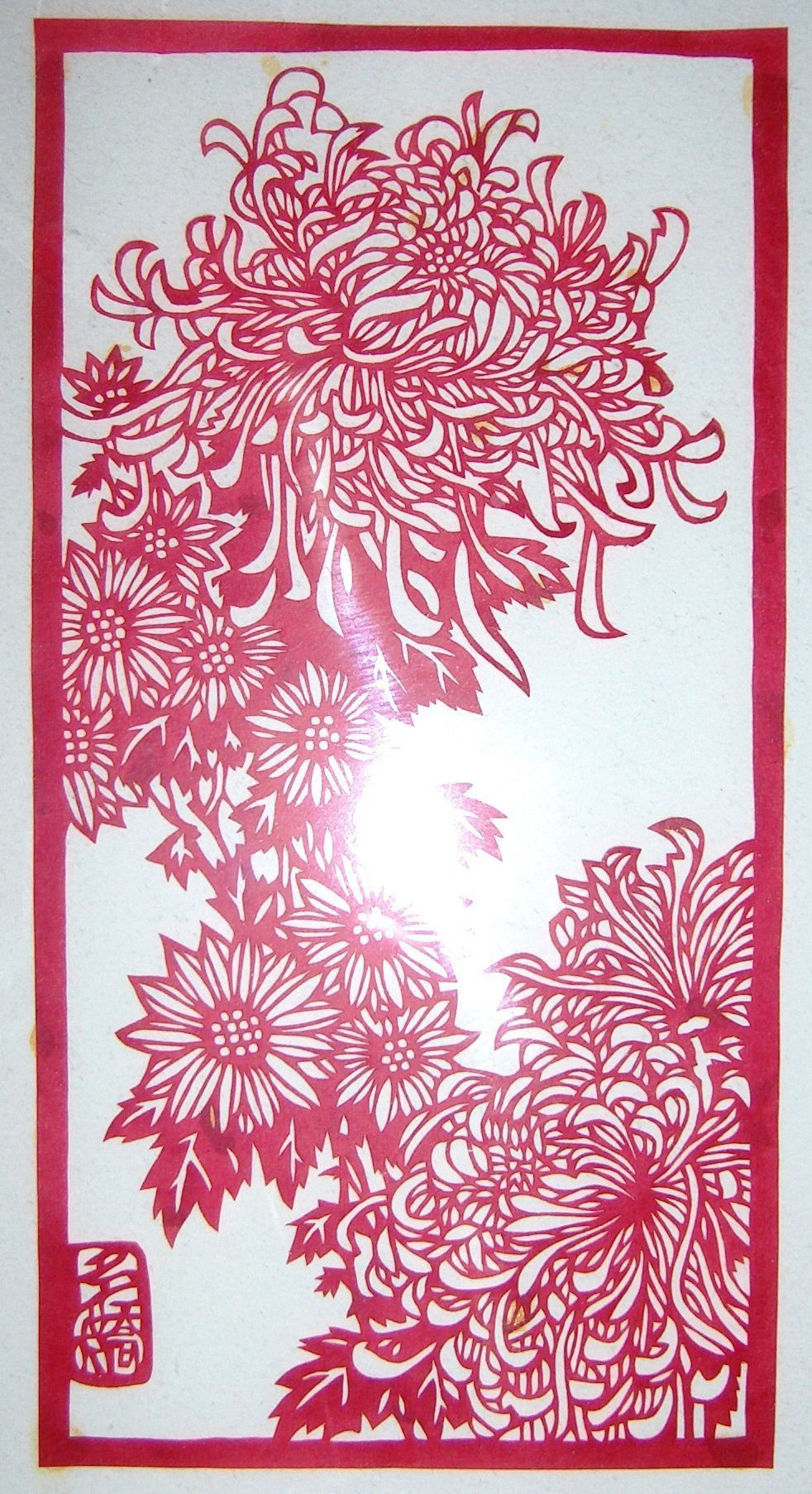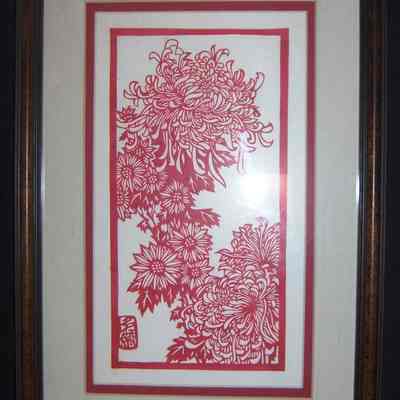 This is a paper cut from China, made out of red paper. The scene depicts flowers going in a diagonal across the page bottom right to top left. There are Chinese characters on the bottom left corner but it is unknown to what they mean.Collection