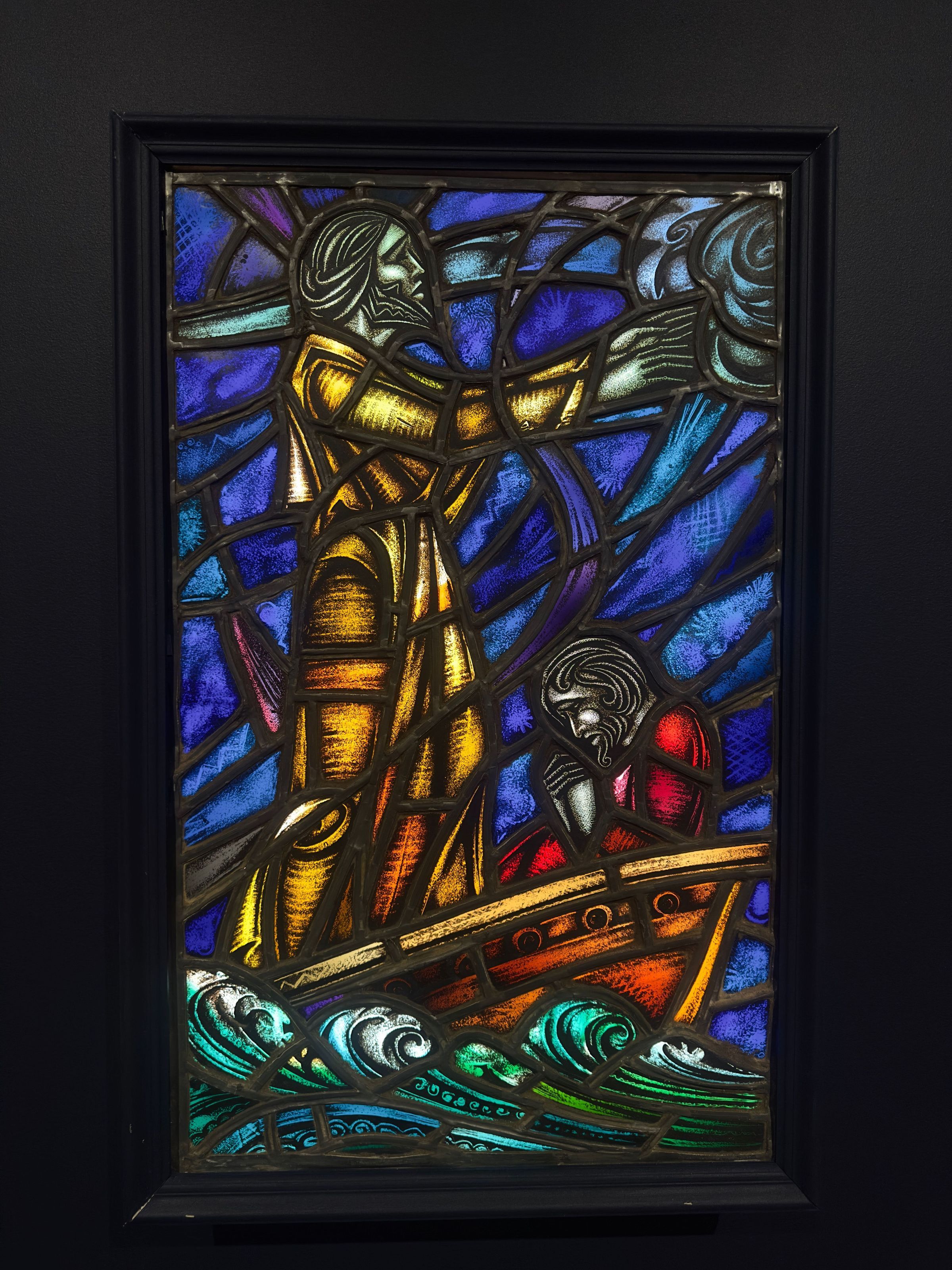 A stained glass window by Louise Pitassi Ellis depicting Christ calming the storm.Collection