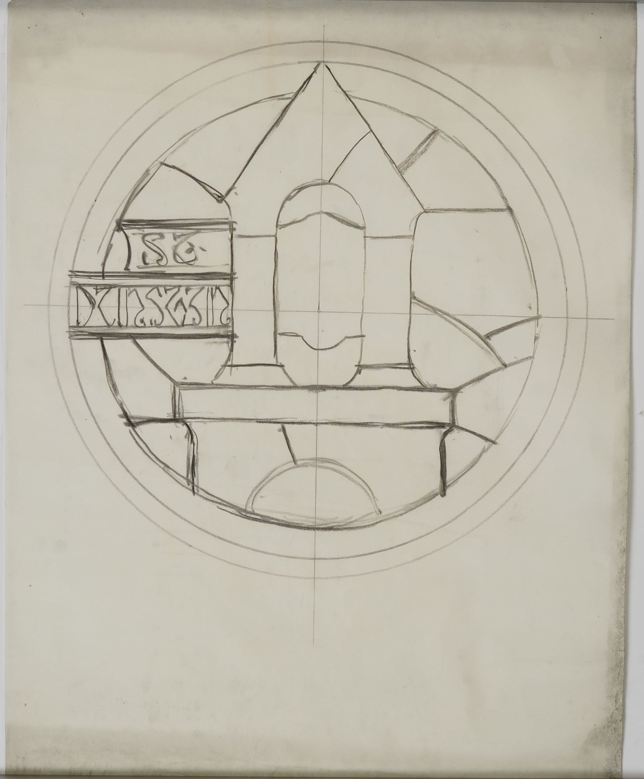 Stained Glass scale drawing, likely done by Louise Pitassi Ellis, unknown site. Depicts a church tower and reads "St. Dunstan."Type of Drawing