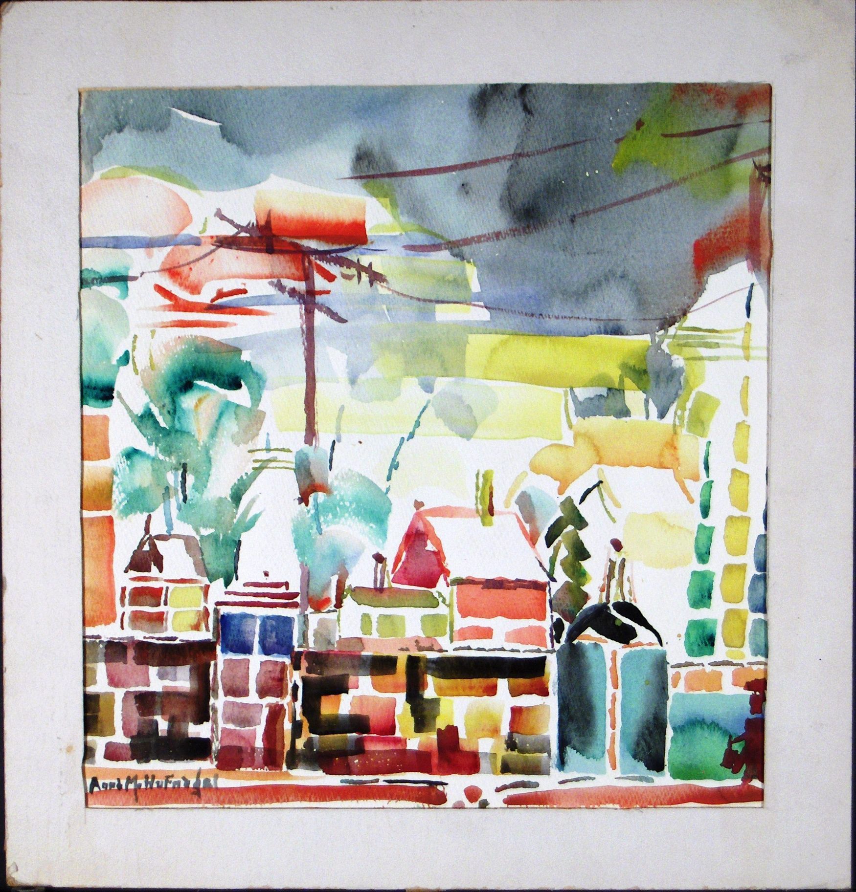 Art, Painting, Watercolor, Art, Painting, Watercolor, Cityscapes, Cities, Urban, Telephone poles, Buildings, Streets, Gates