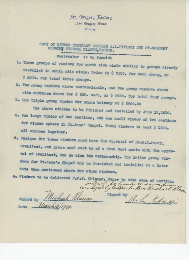 Contract between Michael Klasen and Leo Pitassi approving the commission of additional windows at St. Gregory the Great Church in Chicago, Illinois.Collection