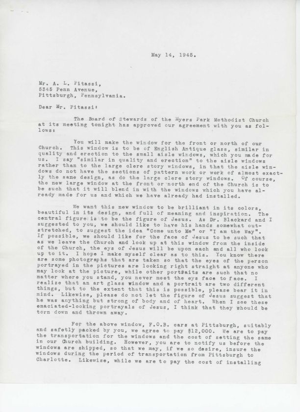 Contract between Myers Park Methodist Church and Leo Pitassi, confirming that Pitassi will complete the front/north window of the church.Collection