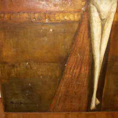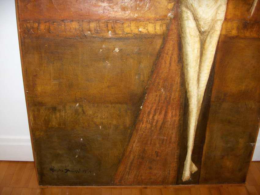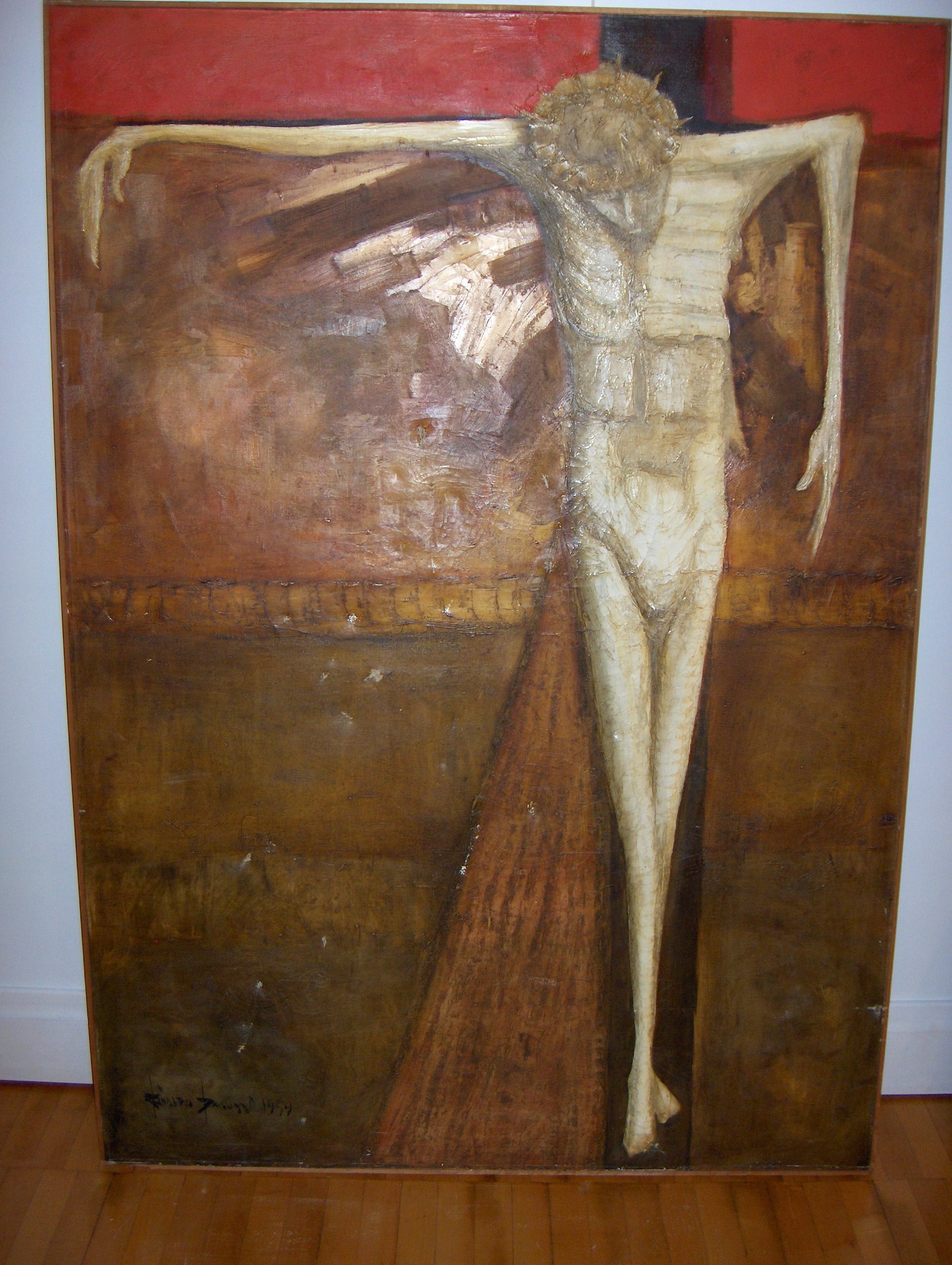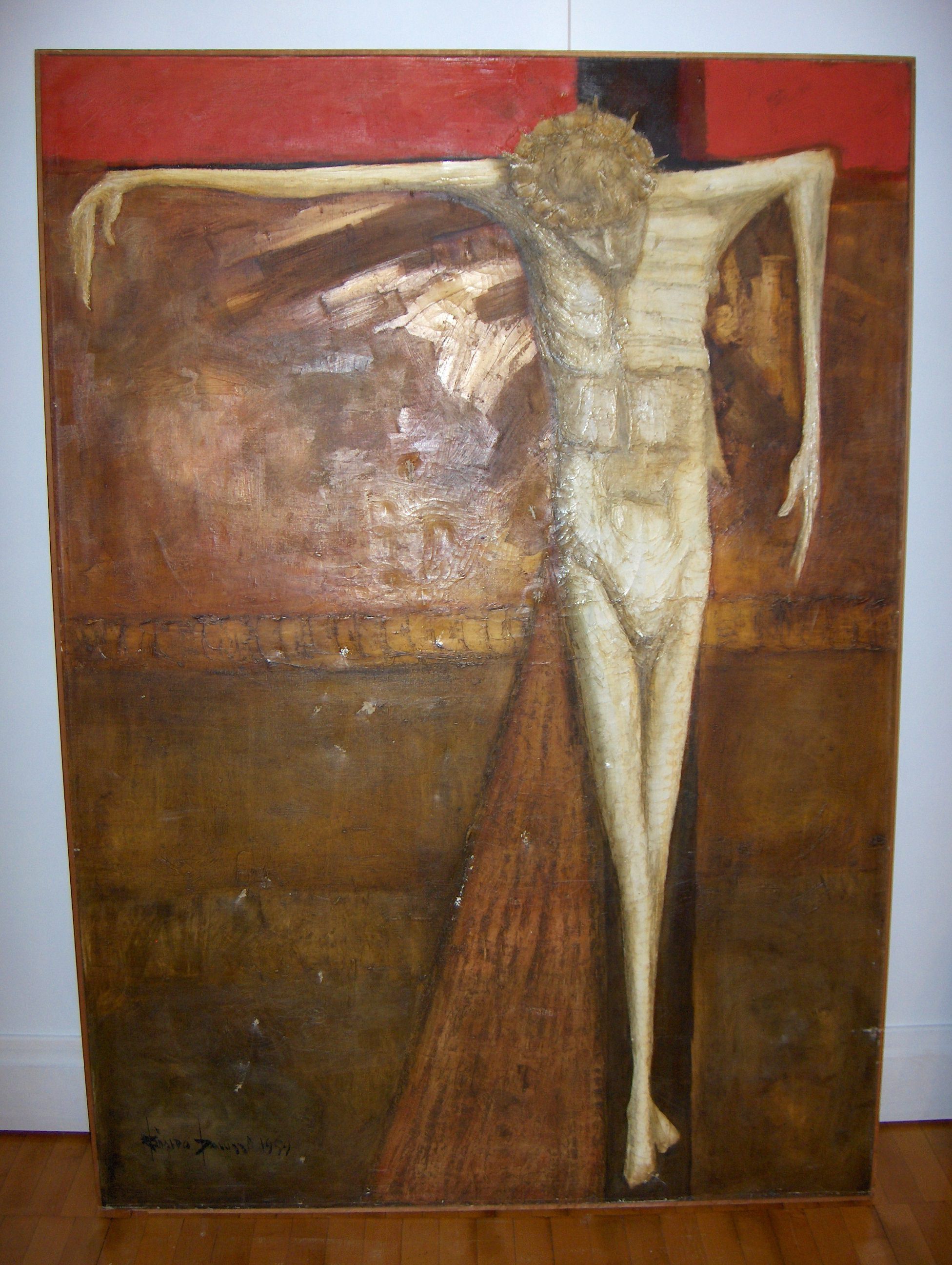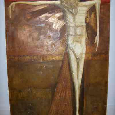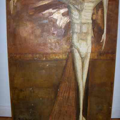 Notes: Artist visited Saint Vincent September 6, 2009, to see painting. He states that he gave the painting to St. Bruno Church in South Greensburg, Pennsylvania in 1959 and that it hung in the back of the church. Later he found that sometime, probably the 1970s, the Pastor didn't like the work and that it was given to Saint Vincent to be placed in the Cyypt Church of the Basilica. In 1983, the painting was in the painting storage room. It is not known if the work every hung in the Crypt.