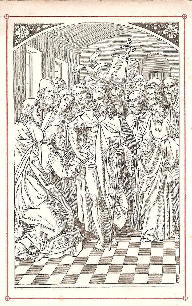 This is a reproduction of a 16th century engraving of the account of Thomas the Apostle, who doubted the resurrection of Jesus and demanded to feel Jesus' wounds before being convinced. Jesus is on the right holding a resurrection banner and is surrounded by his apostles. Thomas is on the left about to stick his two fingers into the chest wound of Jesus. This is 2 out of 3 of the same print.