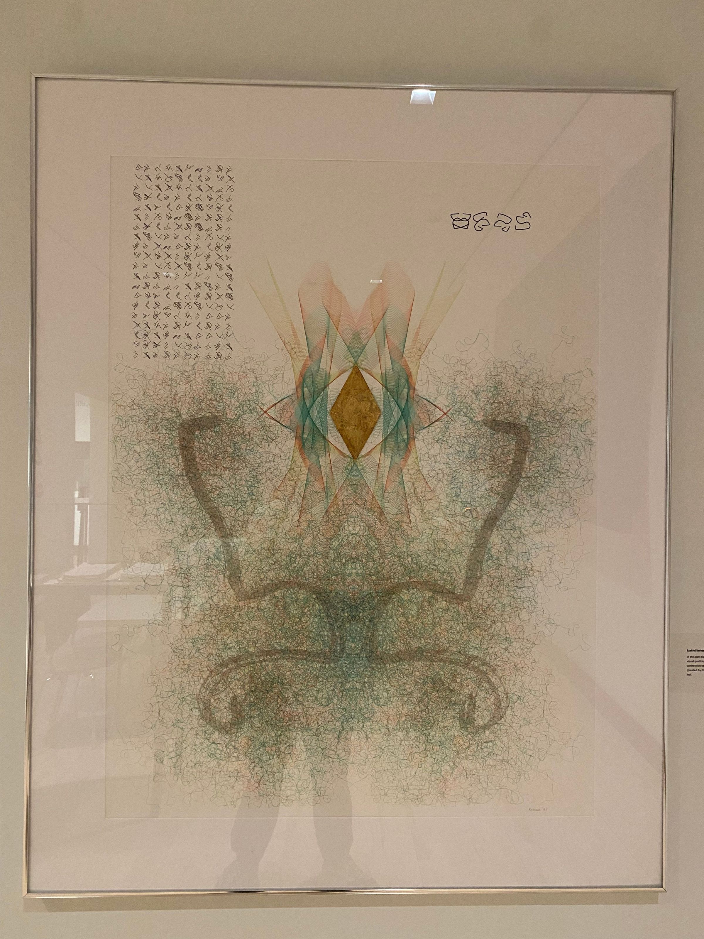 In this pen plotter drawing from the artist’s Ezekiel Series, glyphic texts mime the visual qualities of language without form decipherable letters. Heightening the connection to medieval manuscript illumination, Verostko enhanced the sheet (created by the pen plotter he called his “electronic scribe”) with touches of gold leaf.Created By
