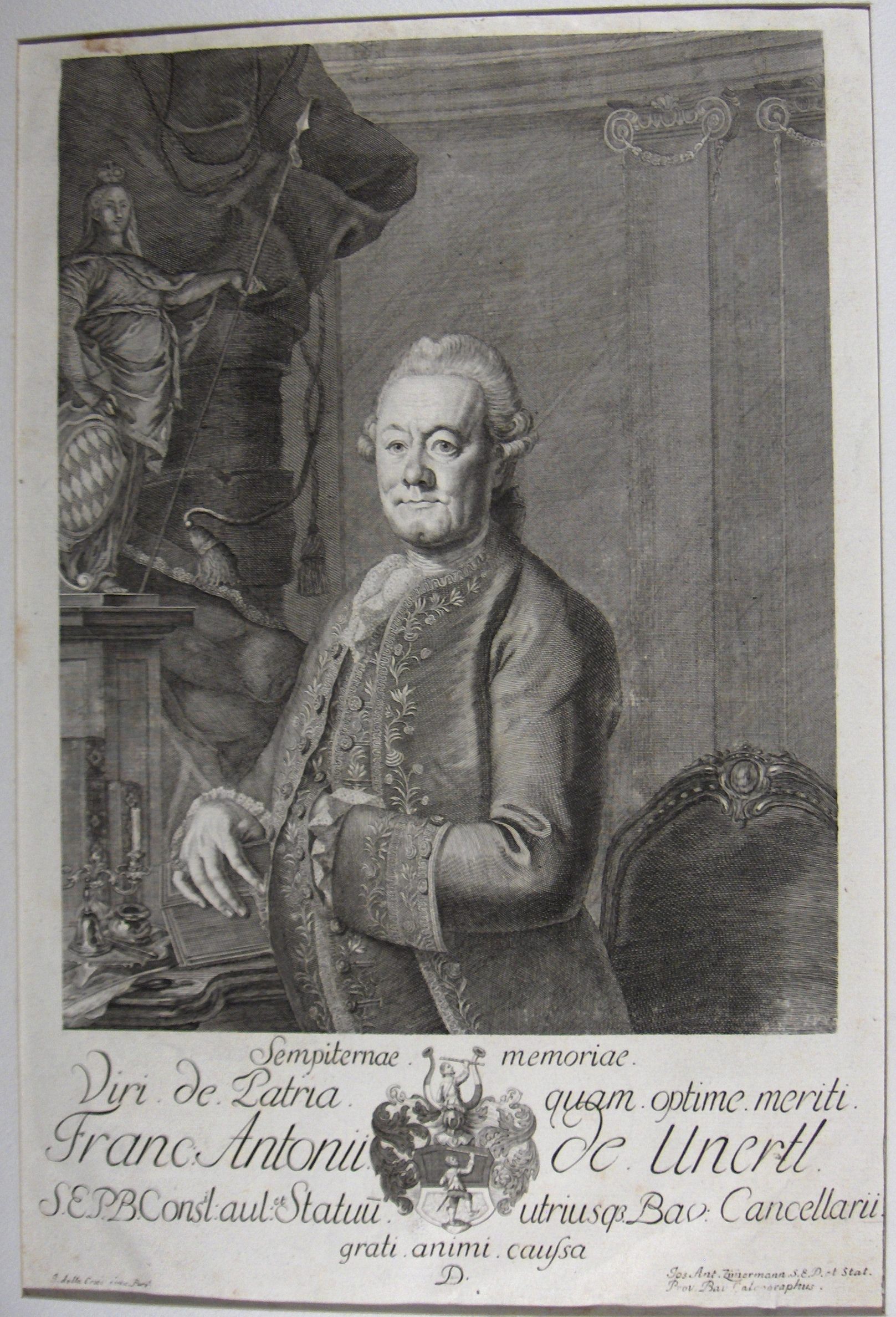 Dedicated to the eternal memory of the most meritous gentleman of the Fatherland, Anthony de Unerti S.E.P.B Chancellor of Bavaria with joyful spirit.Material/Technique