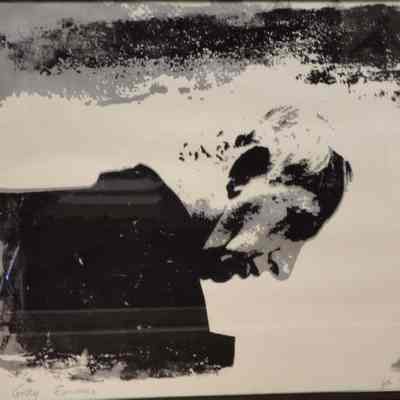 Print depicts man, with head angled. Print compossed in colors of black, sand silver upon a white background.Collection