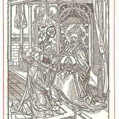 This is a reproduction of a 16th century engraving of the Holy Trinity (The Father, Son, and Holy Spirit). The Father is the man sitting on a throne on the right side, he is also holding a crown in his hand. Jesus, the Son, is on the left side kneeling before the Father. At his knees are his cross, crown of thorns, and torture weapons that were used on him. The Holy Spirit is in between the Father and the Son, the dove, flying above both of them. This is 2 out of 9 of the same print.Collection