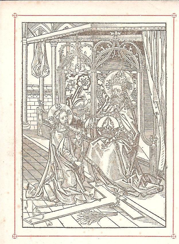 This is a reproduction of a 16th century engraving of the Holy Trinity (The Father, Son, and Holy Spirit). The Father is the man sitting on a throne on the right side, he is also holding a crown in his hand. Jesus, the Son, is on the left side kneeling before the Father. At his knees are his cross, crown of thorns, and torture weapons that were used on him. The Holy Spirit is in between the Father and the Son, the dove, flying above both of them. This is 7 out of 9 of the same print.Collection