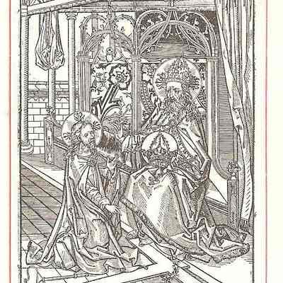 This is a reproduction of a 16th century engraving of the Holy Trinity (The Father, Son, and Holy Spirit). The Father is the man sitting on a throne on the right side, he is also holding a crown in his hand. Jesus, the Son, is on the left side kneeling before the Father. At his knees are his cross, crown of thorns, and torture weapons that were used on him. The Holy Spirit is in between the Father and the Son, the dove, flying above both of them. This is 5 out of 9 of the same print.Collection