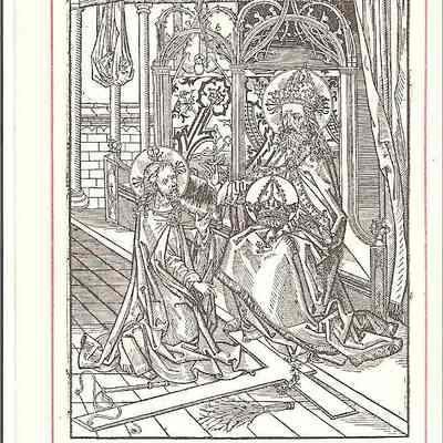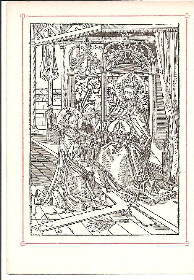 This is a reproduction of a 16th century engraving of the Holy Trinity (The Father, Son, and Holy Spirit). The Father is the man sitting on a throne on the right side, he is also holding a crown in his hand. Jesus, the Son, is on the left side kneeling before the Father. At his knees are his cross, crown of thorns, and torture weapons that were used on him. The Holy Spirit is in between the Father and the Son, the dove, flying above both of them. This is 6 out of 9 of the same print.Collection
