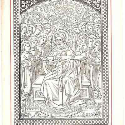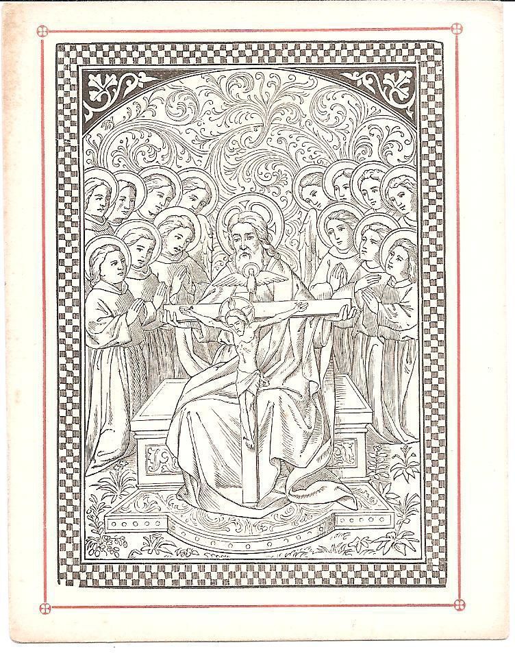 This is a reproduction of a 16th century engraving of the Holy Trinity (The Father, Son, and Holy Spirit). The Father is portrayed as a man who is in the center and is holding up Jesus being crucified on the cross who is the Son. Then right above Jesus's head is a dove, the Holy Spirit. Surrounding them are saints who are all on their knees praying. This is 1 out of 1 of the same print.