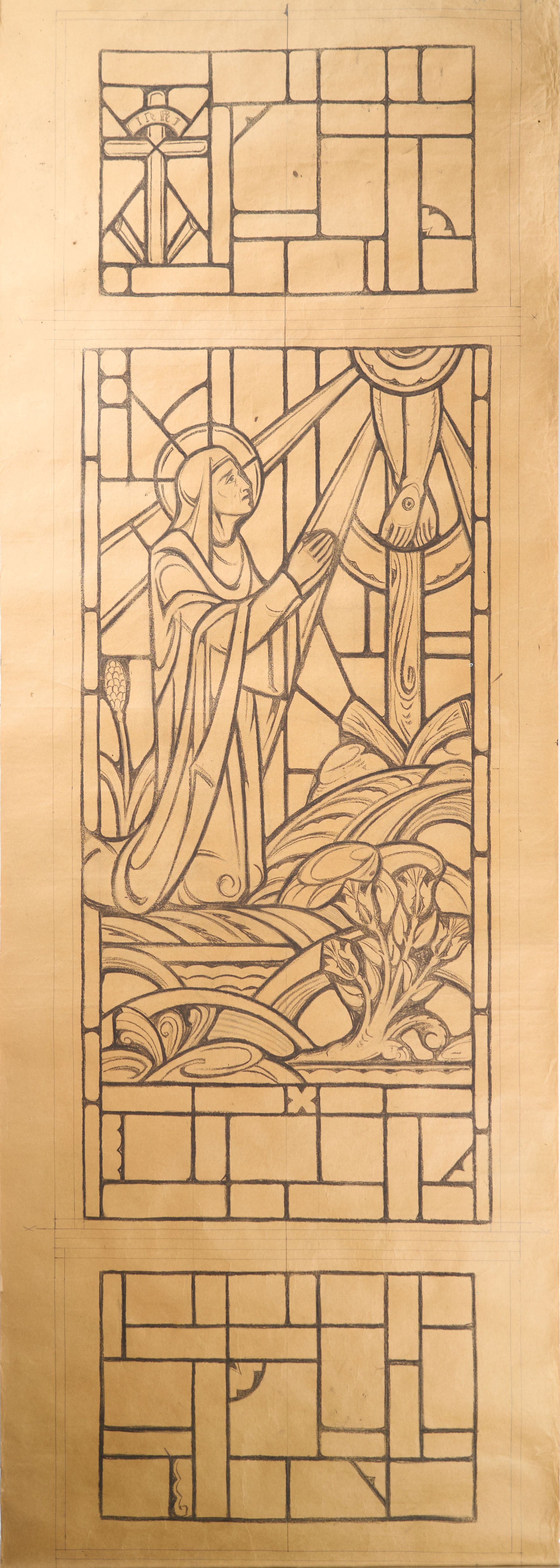 Stained glass scale cartoon, aisle window at Mother of Good Counsel Church in Homewood, Pittsburgh, Pennsylvania. Depicts Mary praying at the foot of the Cross. More info, and in-situ image here: https://www.youtube.com/watch?v=jDQwAXB4QSQ.Type of Drawing