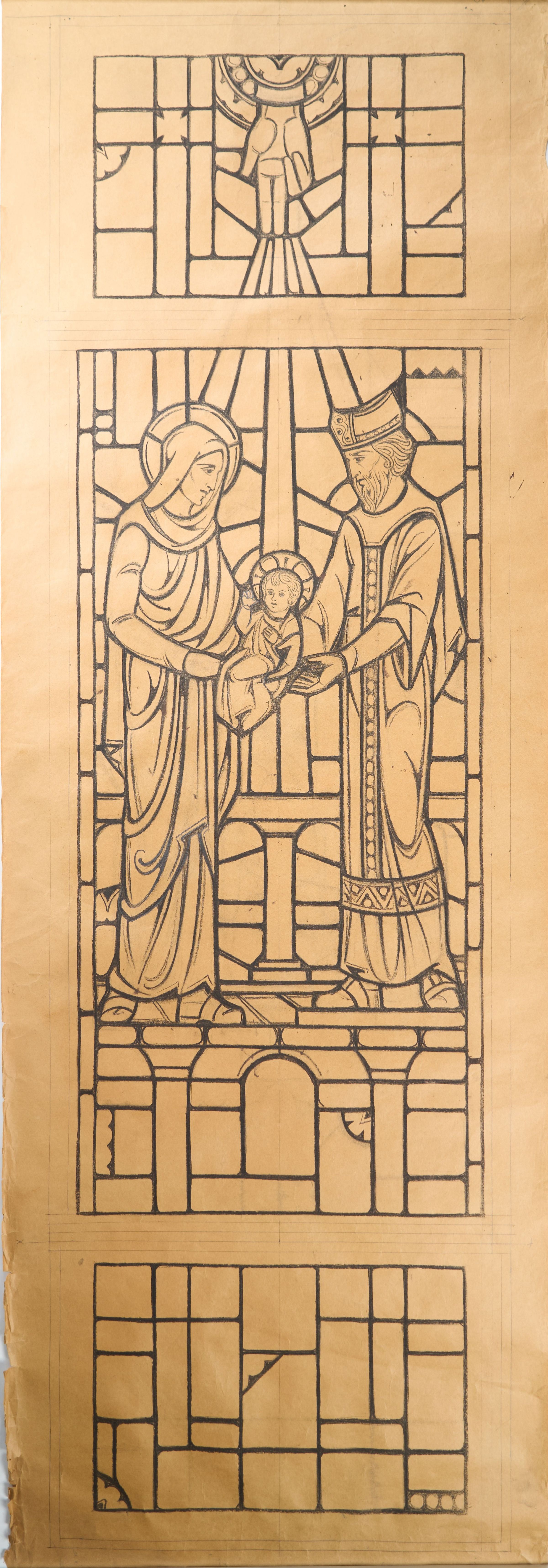 Stained glass scale cartoon, aisle window at Mother of Good Counsel Church in Homewood, Pittsburgh, Pennsylvania. Depicts Mary presenting the infant Christ at the temple. More info, and in-situ image here: https://www.youtube.com/watch?v=jDQwAXB4QSQ.Type of Drawing