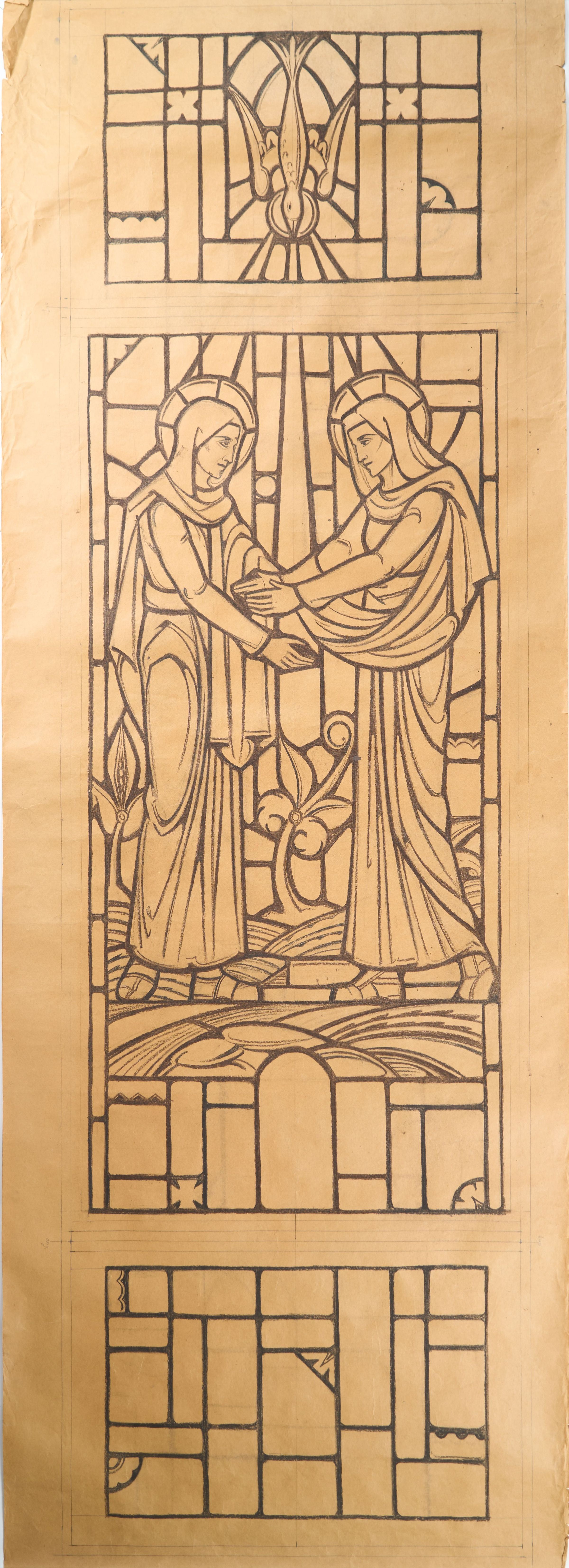 Stained glass scale cartoon, aisle window at Mother of Good Counsel Church in Homewood, Pittsburgh, Pennsylvania. Depicts Mary with Elizabeth during the Visitation. More info, and in-situ image here: https://www.youtube.com/watch?v=jDQwAXB4QSQ.Type of Drawing