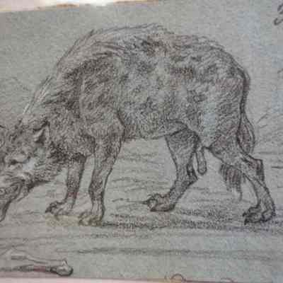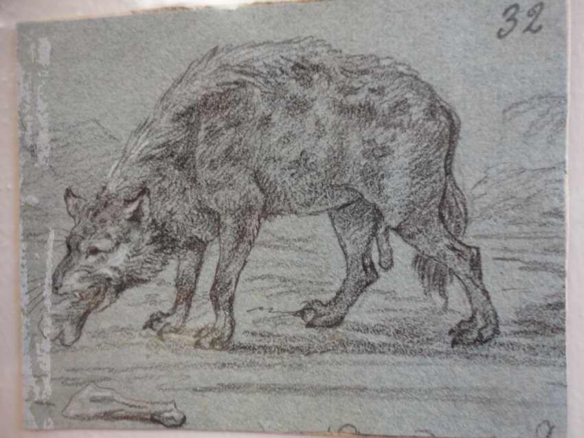 This canine is drawn against a blue paper and appears to be eating something. A possible animal study.Collection
