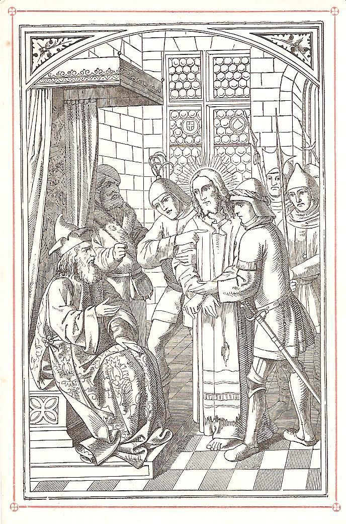 This is a reproduction of a 16th century engraving of Jesus beforePontius Pilate. Pilate is sitting on a throne on the left side while Jesus is surrounded by soliders holding onto him. This is 2 out of 2 of the same print.Collection