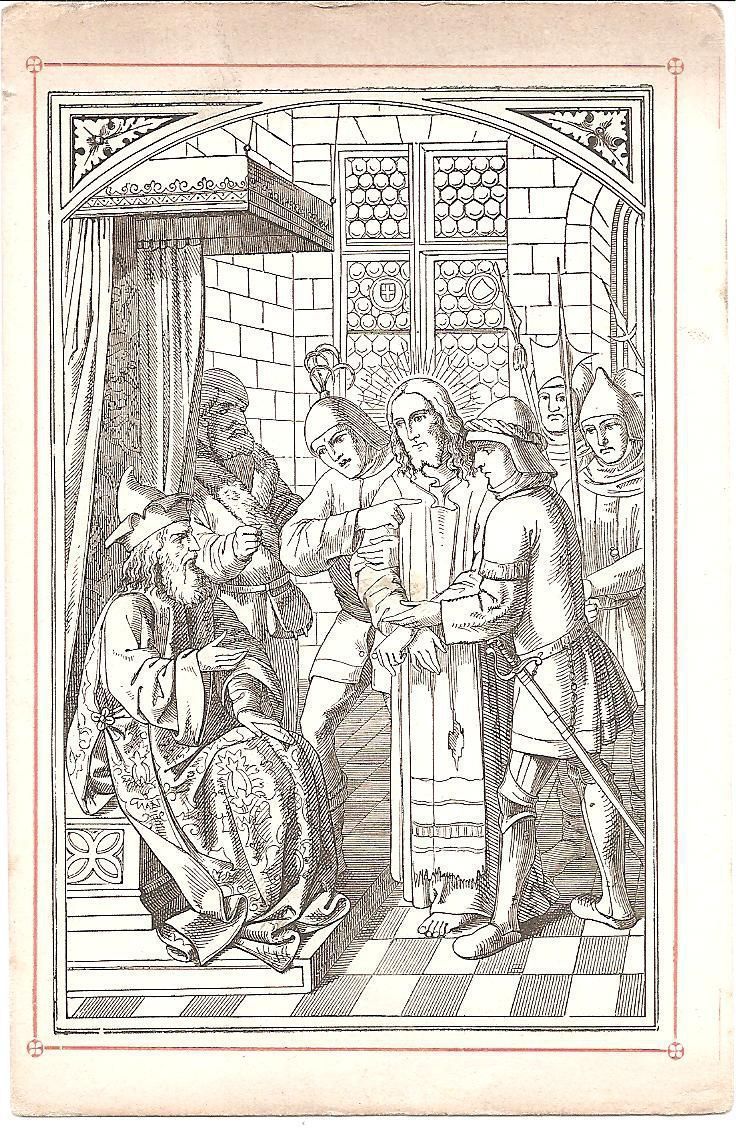 This is a reproduction of a 16th century engraving of Jesus beforePontius Pilate. Pilate is sitting on a throne on the left side while Jesus is surrounded by soliders holding onto him. This is 1 out of 2 of the same print.Collection