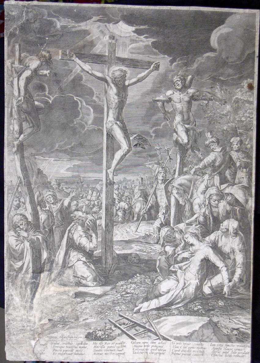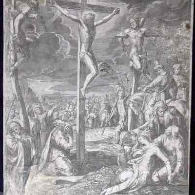 Engraving, Artwork, Ink, Jesus Dies on the Cross, Crucifixion, Cross, Jesus, Christ, INRI, Mary, Skull, Crowds, Golgotha, Men, Engraving, Artwork, Ink