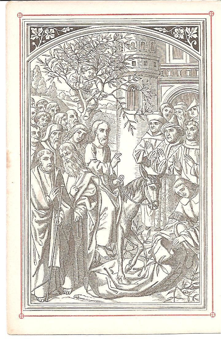 This is a reproduction of a 16th century engraving of Jesus entering into the city of Jerusalem riding on a donkey. As Jesus rode into Jerusalem, the people spread their coats in front of Him and greeted Him with palm branches. This day is celebrated as Palm Sunday. This is 4 out of 4 of the same print.
