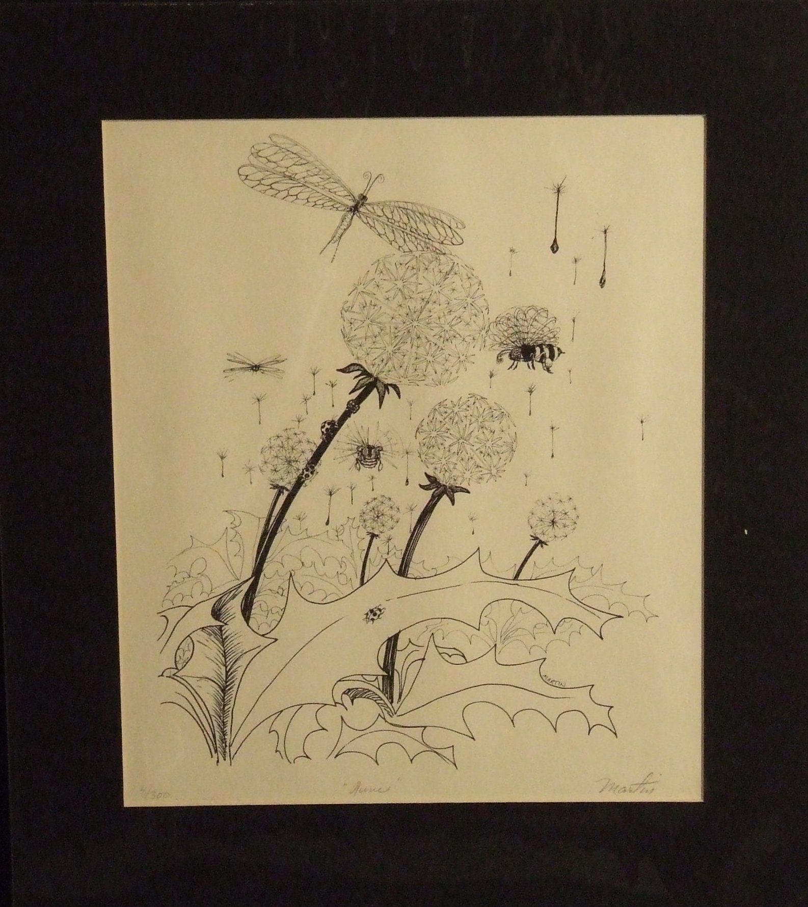 Nature, Dandelions, Dragonflies, Bees, Ink, Paper, Print, Lithograph, Ink