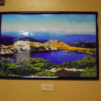 Photograph of a landscape featuring a blue lake in the foreground and intense blue skies over a valley.Artwork Details