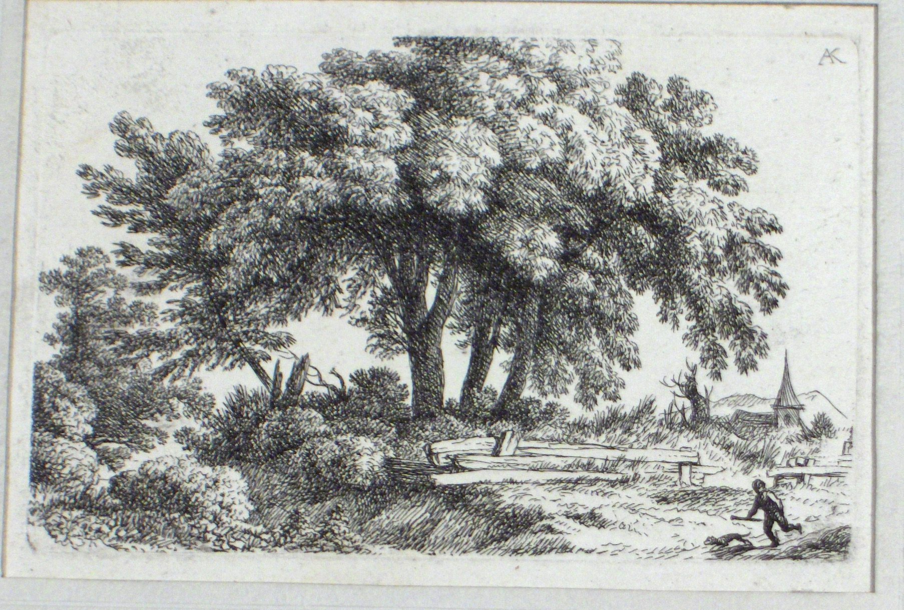 Etching, Artwork, Ink, Landscape, Trees, Dog, Boy, Fence, Brush, Bushes, Anton Kölbl, Etching, Artwork, Ink