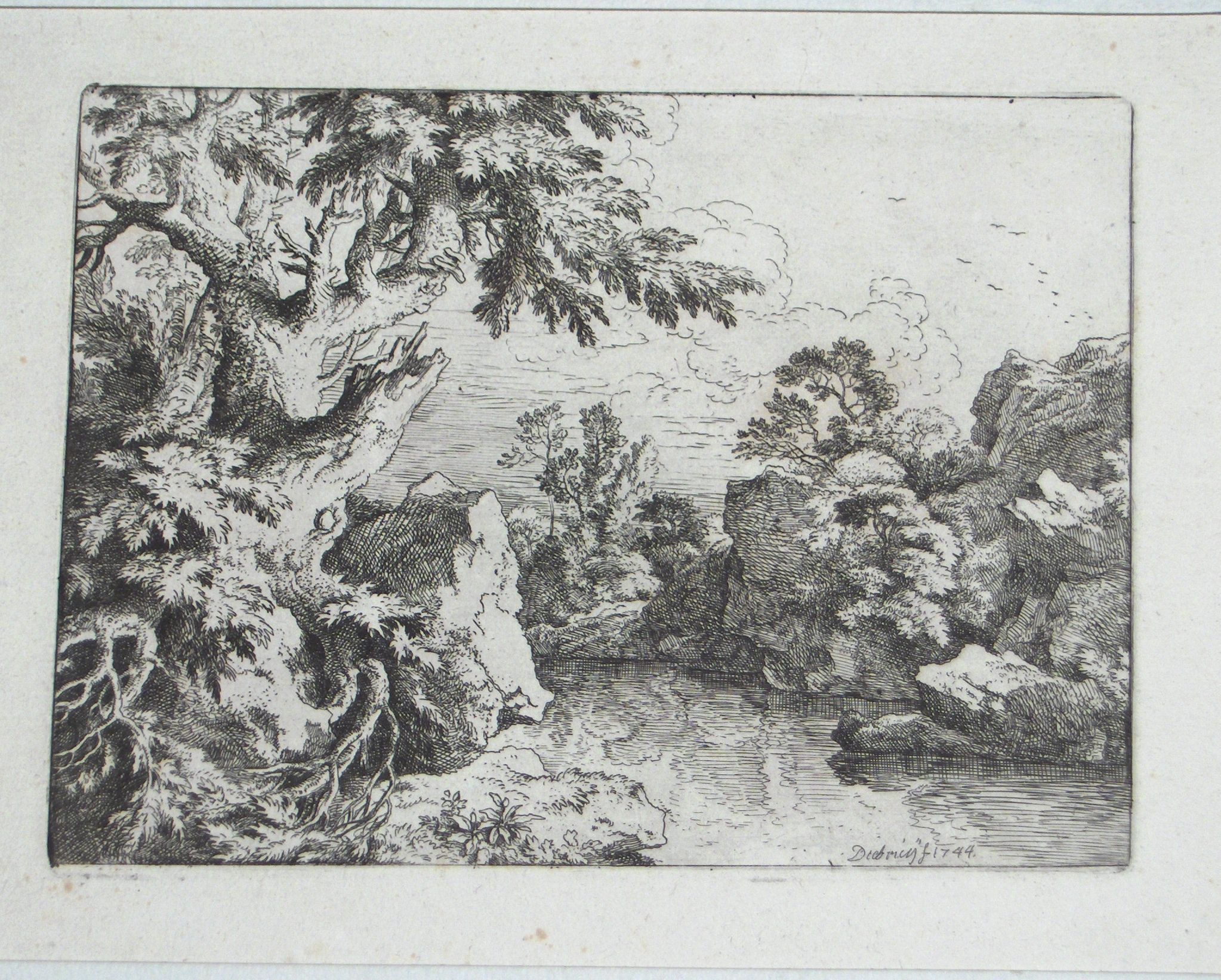 Etching, Artwork, Ink, Dietrich, Christian Wilhelm Ernst, Dietricy, Landscape, Stream, Creek, River, Trees, Rocks, Etching, Artwork, Ink
