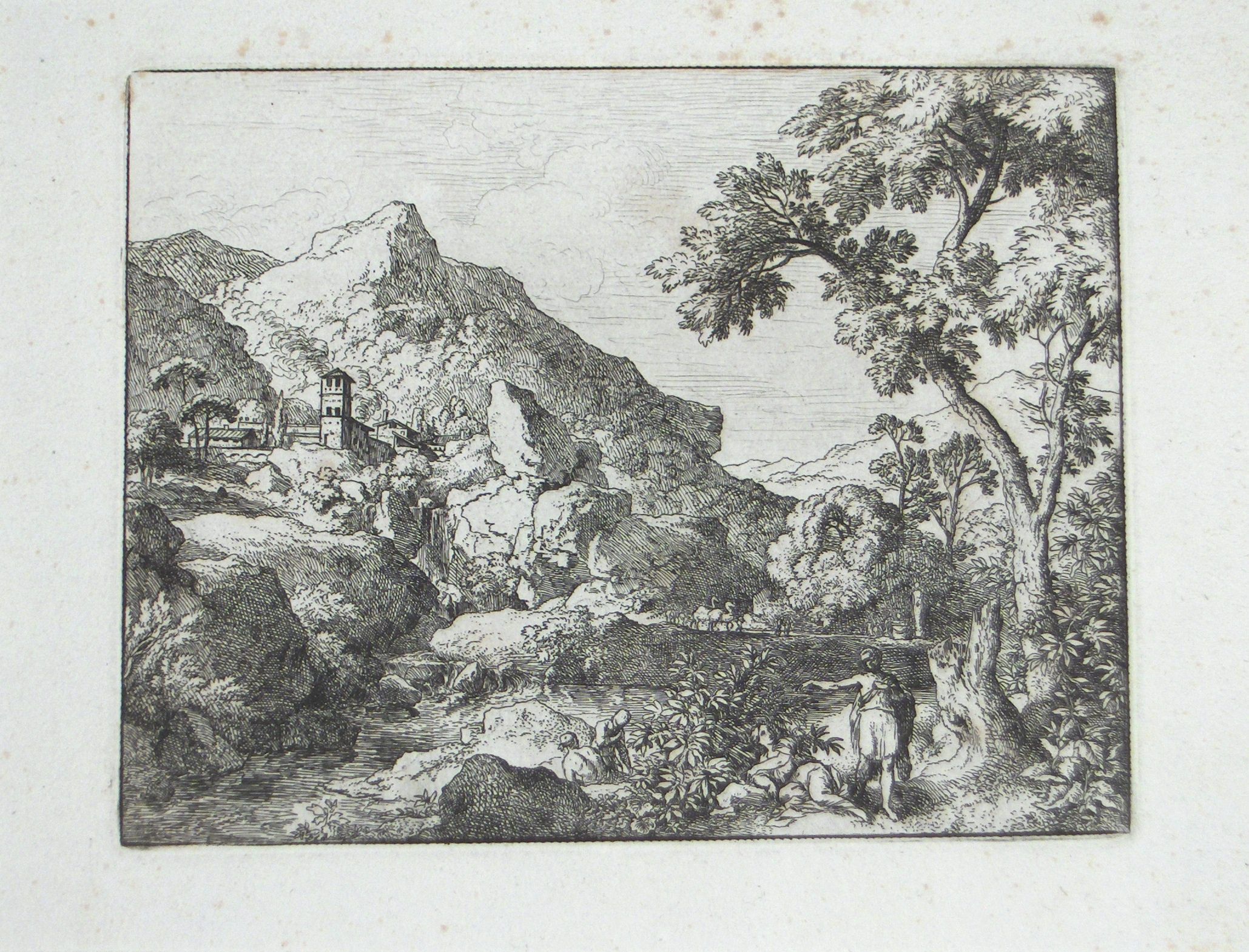 Etching, Artwork, Ink, Dietrich, Christian Wilhelm Ernst, Mountain, Town, Stream, Creek, River, Trees, Forest, Rock, People, Landscape, Etching, Artwork, Ink
