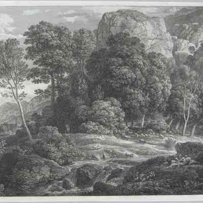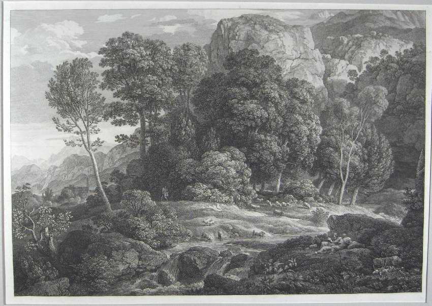 Engraving, Artwork, Ink, Landscape, Sheep, Shepherd, Forest, Woods, Mountains, Field, Stream, Creek, Engraving, Artwork, Ink