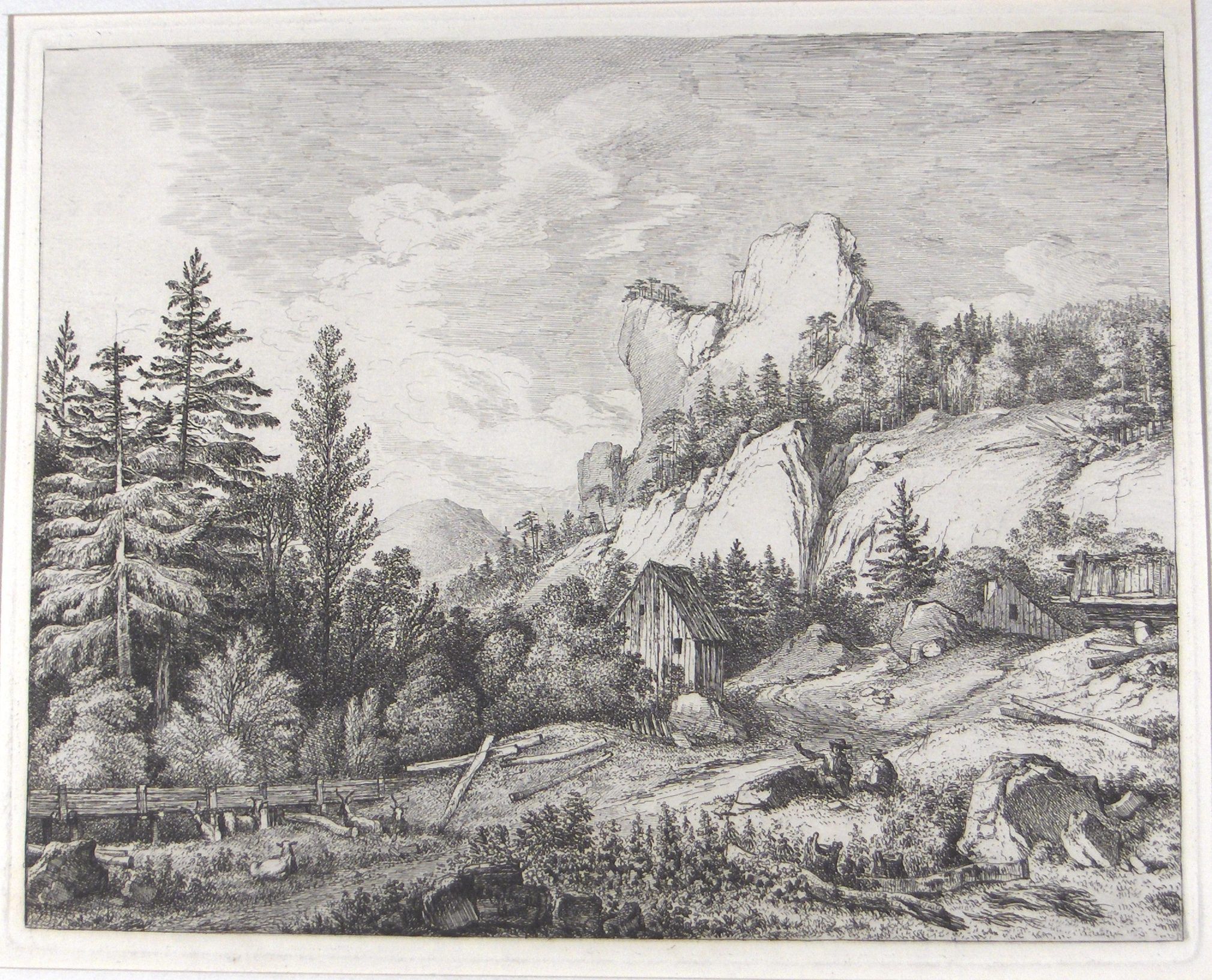Etching, Artwork, Ink, Cliff, Overhang, Rock, Mountain, Cabin, House, Wilderness, Landscape, Logs, Timber, People, Livestock, Rechberger, Franz, Etching, Artwork, Ink