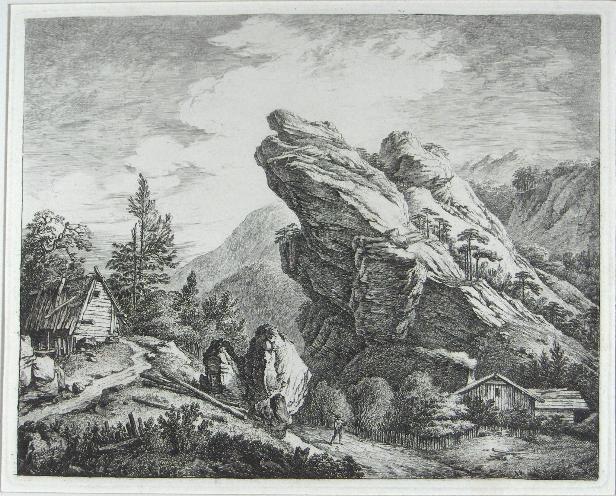 Etching, Artwork, Ink, Cliff, Overhang, Rock, Mountain, Cabin, House, Wilderness, Landscape, Logs, Timber, Rechberger, Franz, Etching, Artwork, Ink