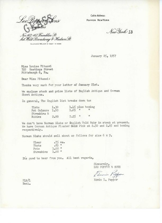 Letter between Louise Pitassi and Edwin L. Popper of Leo Popper & Sons regarding prices of Norman and English slab glass, dated Jan. 25, 1957,Collection